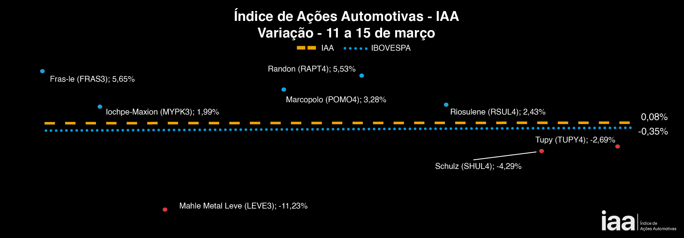 A crise na Petrobras mexeu com o mercado financeiro na semana de 11 a 15 de março na Bolsa de Valores de São Paulo, quebrando uma série de variações positivas nas ações automotivas. O IAA fechou o período em estabilidade de 0,08%. Mesmo com o resultado tímido, o índice que mede o desempenho dessas empresas na Bolsa, superou o ibovespa que registrou queda de -0,35%.