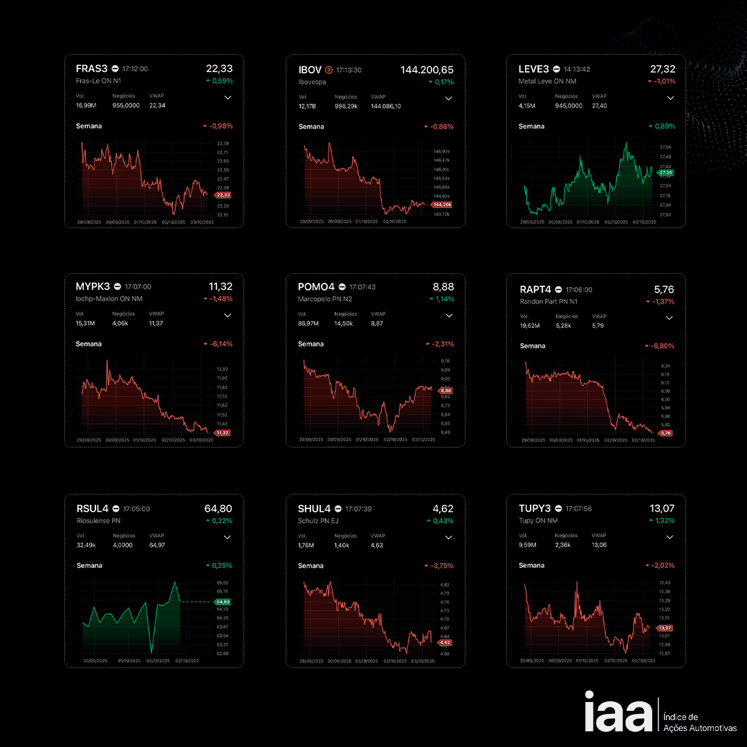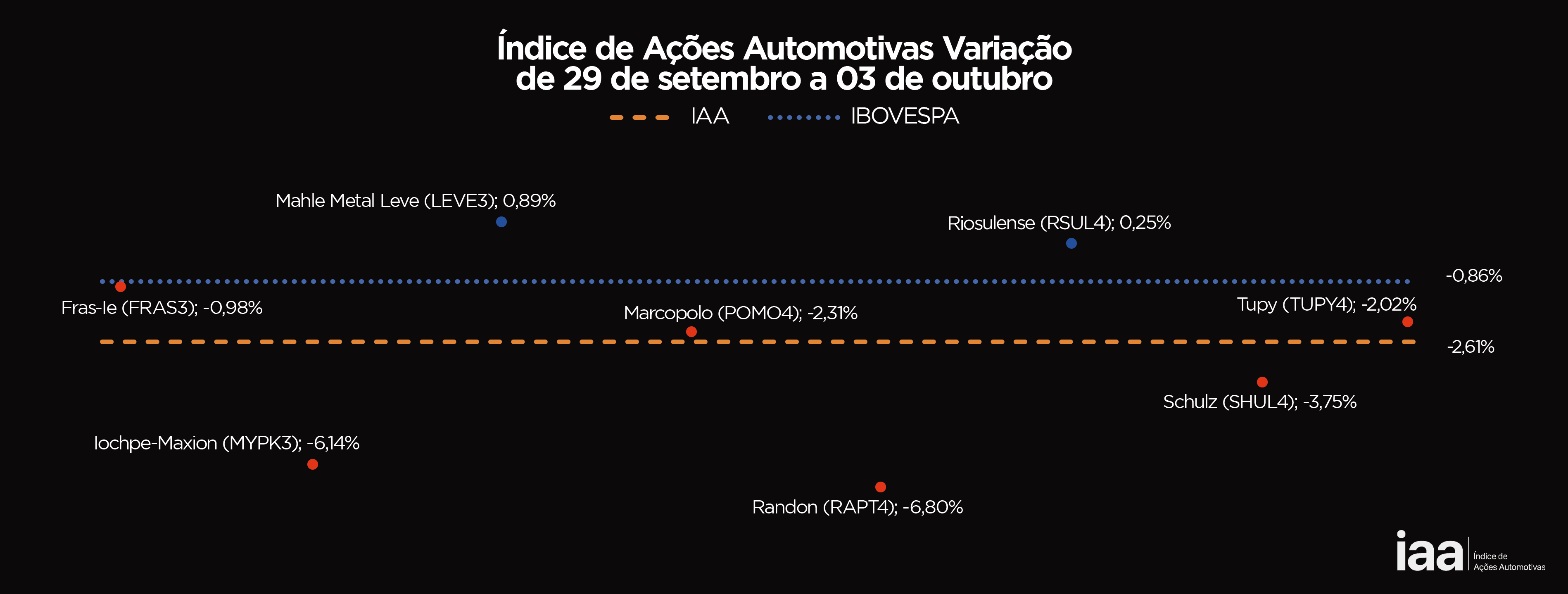 O IAA, que mede o desempenho das ações automotivas listadas na Bolsa de Valores, segue, por mais uma semana, no patamar negativo, com fechamento de -2,61%.