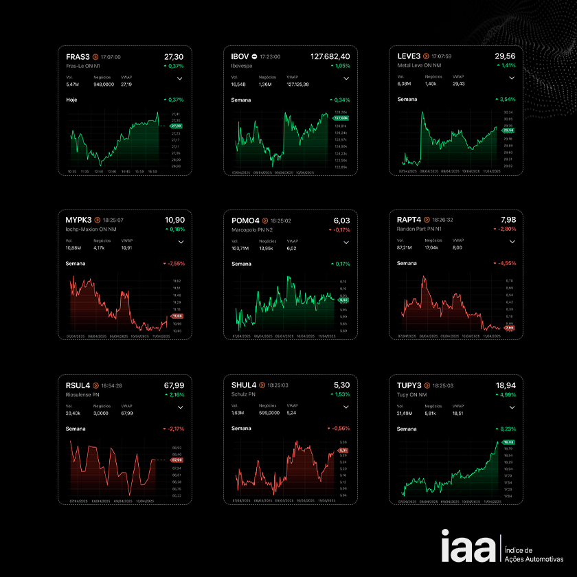 O IAA é o índice criado pelo After.Lab para medir as movimentações nas ações das empresas do setor automotivo listadas em Bolsa. Mesmo que ainda sejam poucas as empresas a operar nessa modalidade, já são suficientes para proporcionar uma leitura sobre o desempenho das operações relacionadas ao universo automotivo que abriram capital e usam o pregão do Ibovespa para conquistar investidores e alavancarem seus negócios.