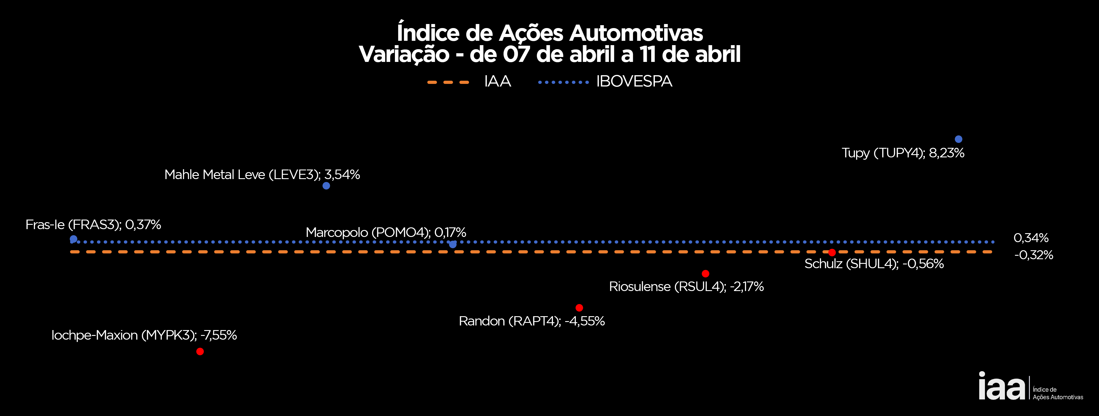 No período, as ações automotivas não acumularam mais perdas, porém, o desempenho não foi suficiente para alavancar o IAA, que fechou com variação negativa de -0,32%, reflexo do pronunciamento da JP Morgan de cautela para as autopeças na América Latina.