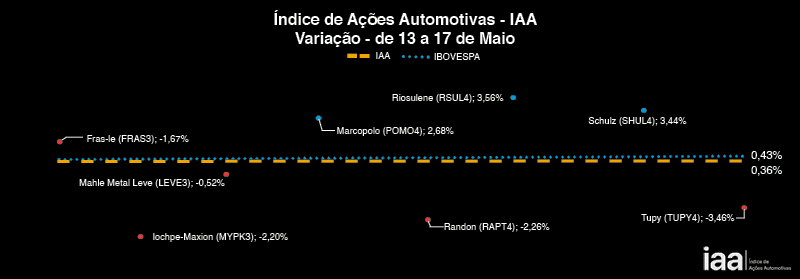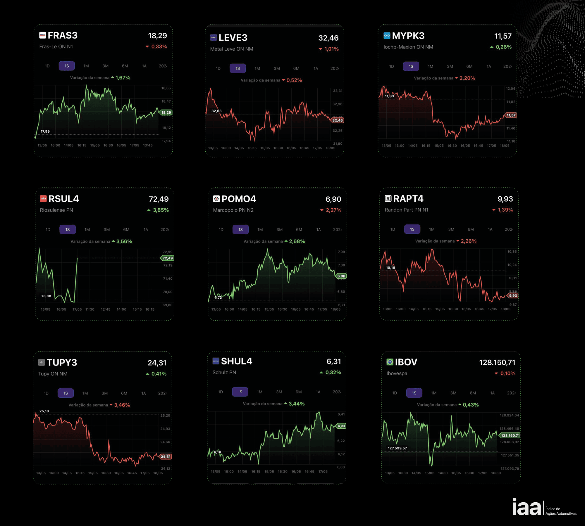 As ações que finalizaram a semana em queda foram as da Mahle Metal Leve (LEVE3) -0,52%;  Fras-le (FRAS3)  -1,67%; Iochpe -Maxion (MYPK3) -2,20%; Randon (RAPT4) -2,26% e Tupy (TUPY4) -3,46%.