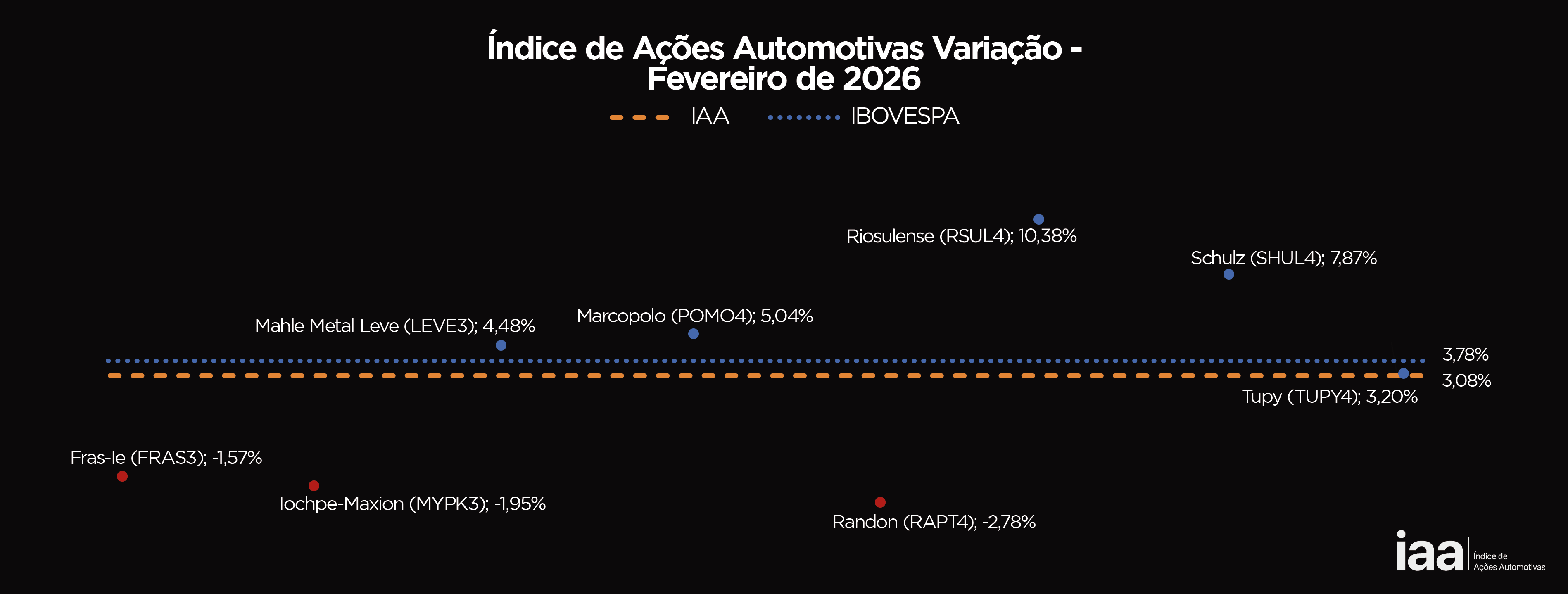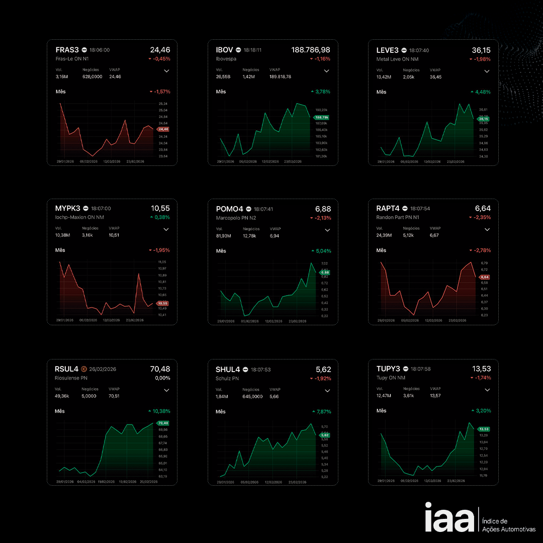 O IAA é o índice criado pelo After.Lab para medir as movimentações nas ações das empresas do setor automotivo listadas em Bolsa. Mesmo que ainda sejam poucas as empresas a operar nessa modalidade, já são suficientes para proporcionar uma leitura sobre o desempenho das operações relacionadas ao universo automotivo que abriram capital e usam o pregão do Ibovespa para conquistar investidores e alavancarem seus negócios.