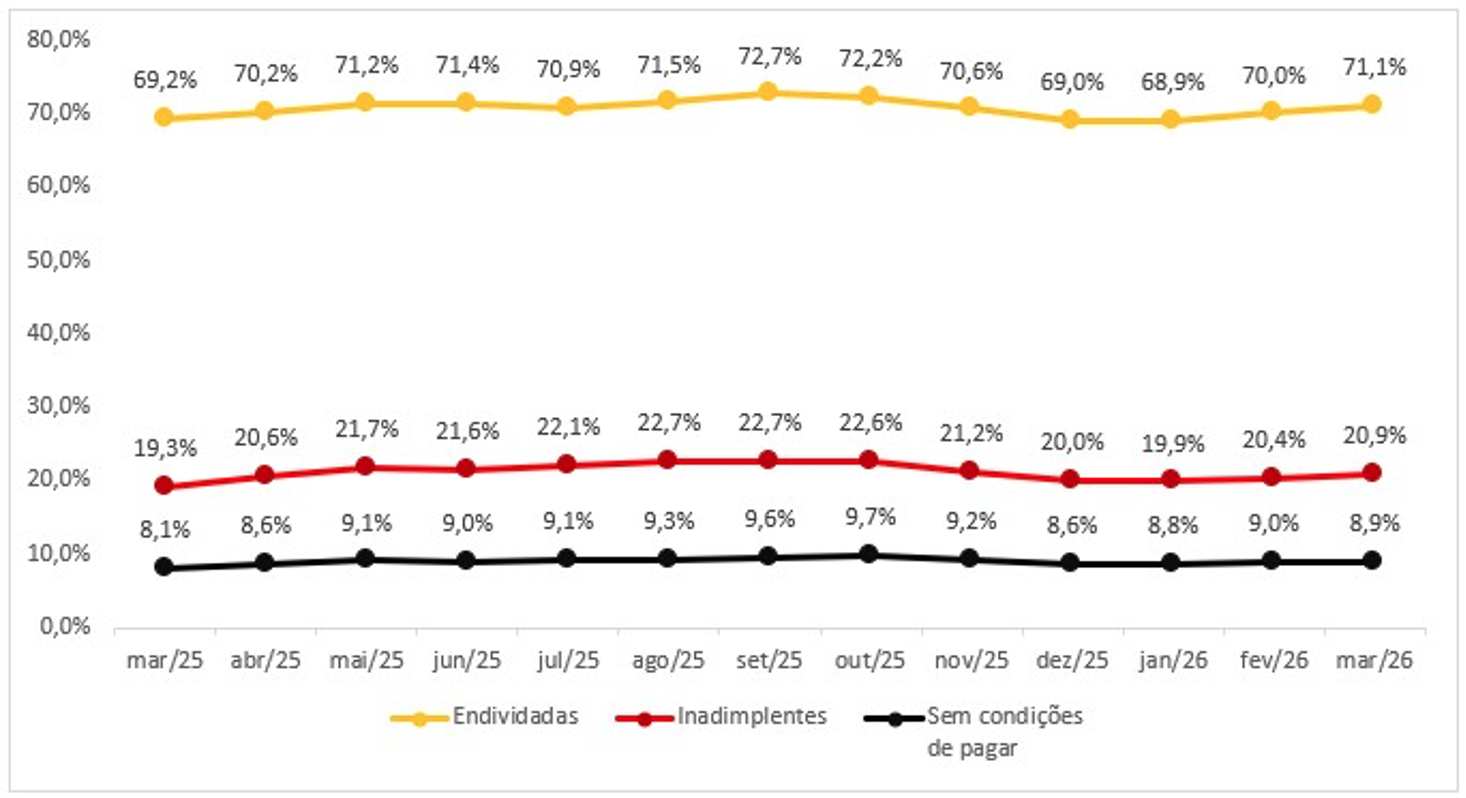 Quanto aos endividados, o porcentual entre as famílias com renda menor que dez salários mínimos ficou em 74,5%, enquanto, entre aquelas que ganham acima desse valor, foi de 61,3%. Ambos os grupos, porém, estão acima do observado em fevereiro (73,5% e 59,8%, respectivamente) e em março de 2025 (73,3% e 57,2%).