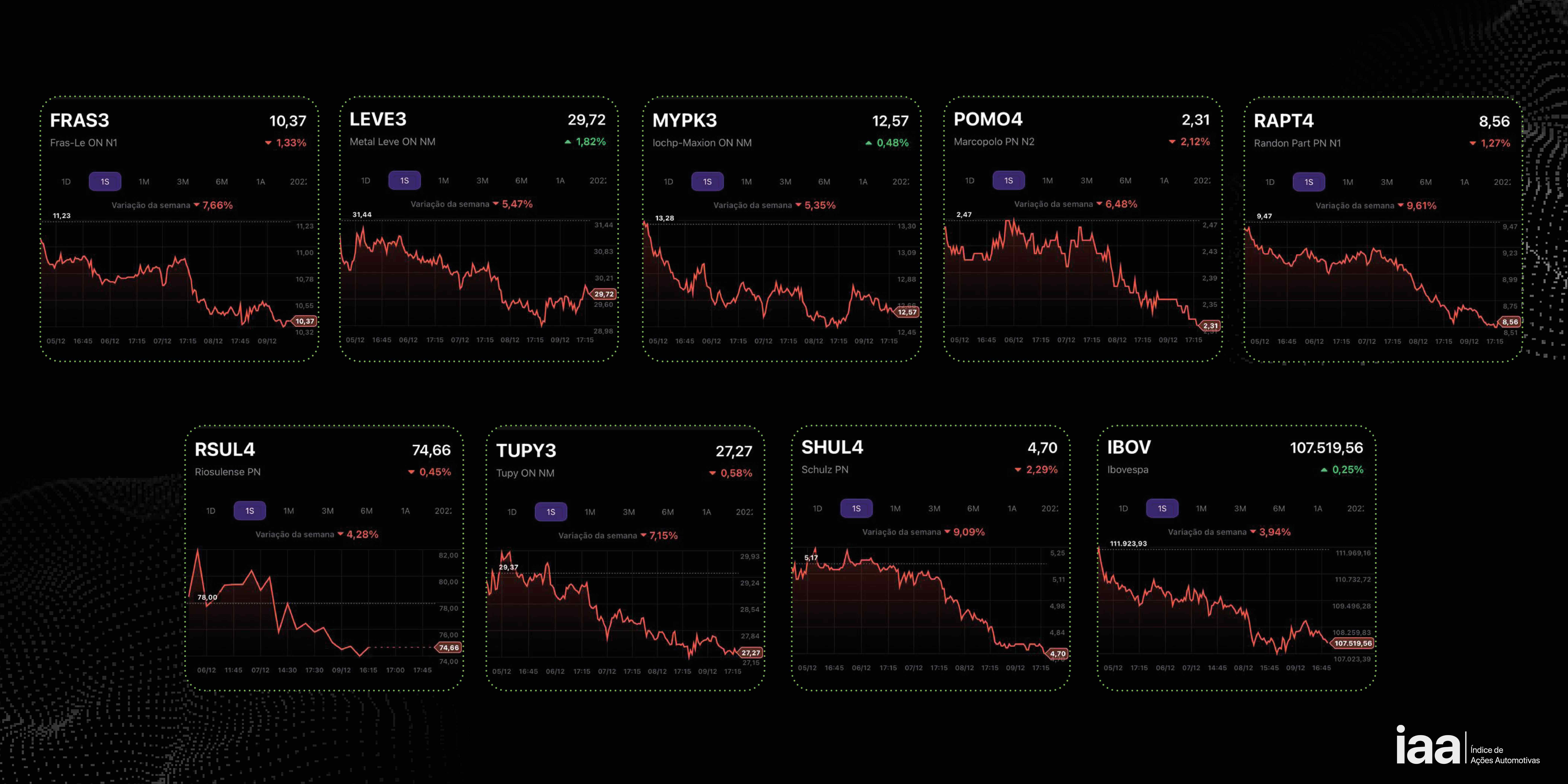 As ações automotivas fecharam a semana de 5 a 9 de dezembro em queda, acompanhando o desempenho negativo do Ibovespa, que encerrou o período com variação negativa de -3,94%.