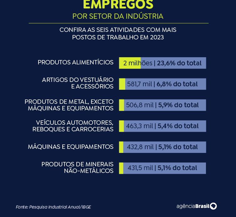 Esse patamar faz com que os fabricantes de alimentos empregassem 23,6% da mão de obra da indústria brasileira. Isso significa praticamente uma em cada quatro pessoas ocupadas.