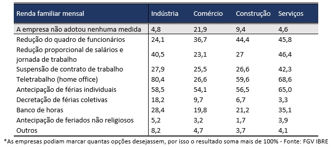 No setor de serviços, o mais afetado pela pandemia ao contrário de crises anteriores, está o maior percentual de empresas que realizaram antecipação de férias individuais de seus colaboradores (65%), reduziram proporcionalmente salários e jornadas de trabalho (46,4%), além de terem enxugado seu quadro de pessoal (45,8%). Chama atenção também o alto percentual de empresas que afirmam terem suspendido contratos de trabalho (42,3%), a maior proporção entre os setores, segundo dados da prévia dos quesitos especiais das sondagens de maio.