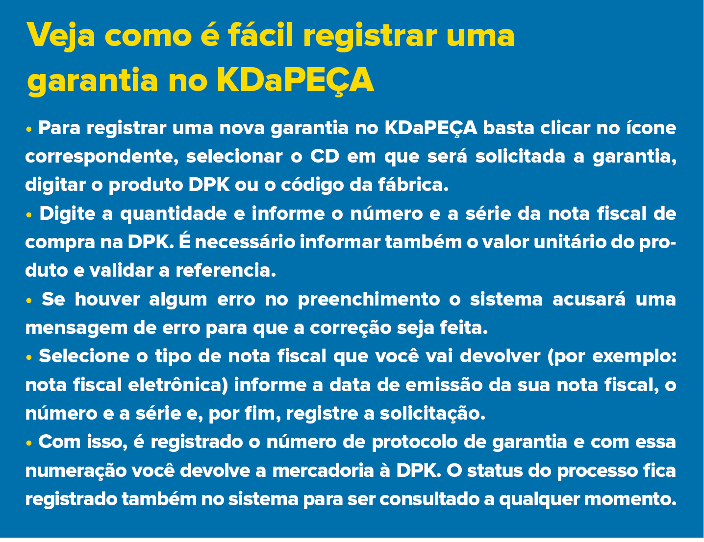 No ícone de garantia do KDaPEÇA é possível consultar em tempo real o status da sua garantia e registrar todas as notas fiscais. Com o histórico das notas e as numerações registradas você consegue saber em qual duplicata se deu o lançamento do crédito de cada garantia concedida, bem como eventuais saldos pendentes para compras futuras. E, para tornar o atendimento ainda mais ágil, solicitando a coleta a DPK retira o produto na sua loja. Com tantas inovações e serviços ao cliente, o sistema de garantia do KDaPeça estabelece uma nova referência no mercado brasileiro de manutenção de veículos.