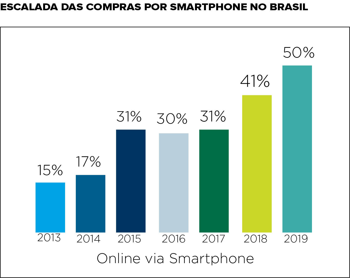 Em uma dessas relações de comparação a partir do tracejar de uma linha do tempo, destacou-se na edição de 2019 a consolidação de um crescimento exponencial das compras via smartphones no Brasil.