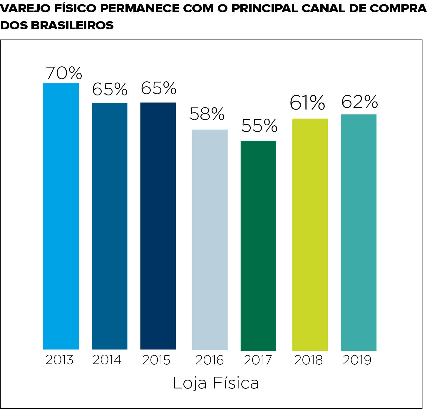 Além da tendência da utilização mais frequente dos celulares por parte dos consumidores, a pesquisa de 2019 revelou a estabilização das lojas físicas no mercado nacional. De 2013 a 2017 o percentual de brasileiros que compravam no varejo físico ao menos uma vez por mês caiu de forma preocupante de 70% para 55%. Em 2018 a modalidade teve uma recuperação significativa, voltando à casa dos 61% e – na atual edição, cresceu um ponto percentual para atingir os 62%.