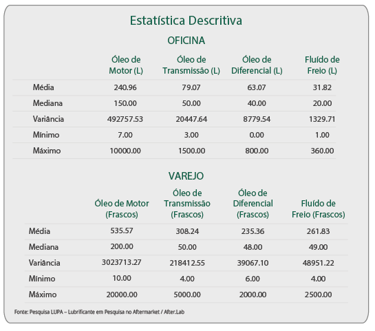 A dispersão é significativamente maior no varejo, como evidenciado pelas variâncias. Isso ocorre devido à maior concentração de grandes estabelecimentos no varejo, que vendem volumes altos. Vemos que o óleo de motor apresenta maior disparidade tanto em oficinas quanto no varejo, refletindo sua alta demanda e diferentes perfis de consumo. Já o fluido de freio, em ambas as categorias, é o mais homogêneo em termos de consumo, com menor variância e máximos mais baixos.