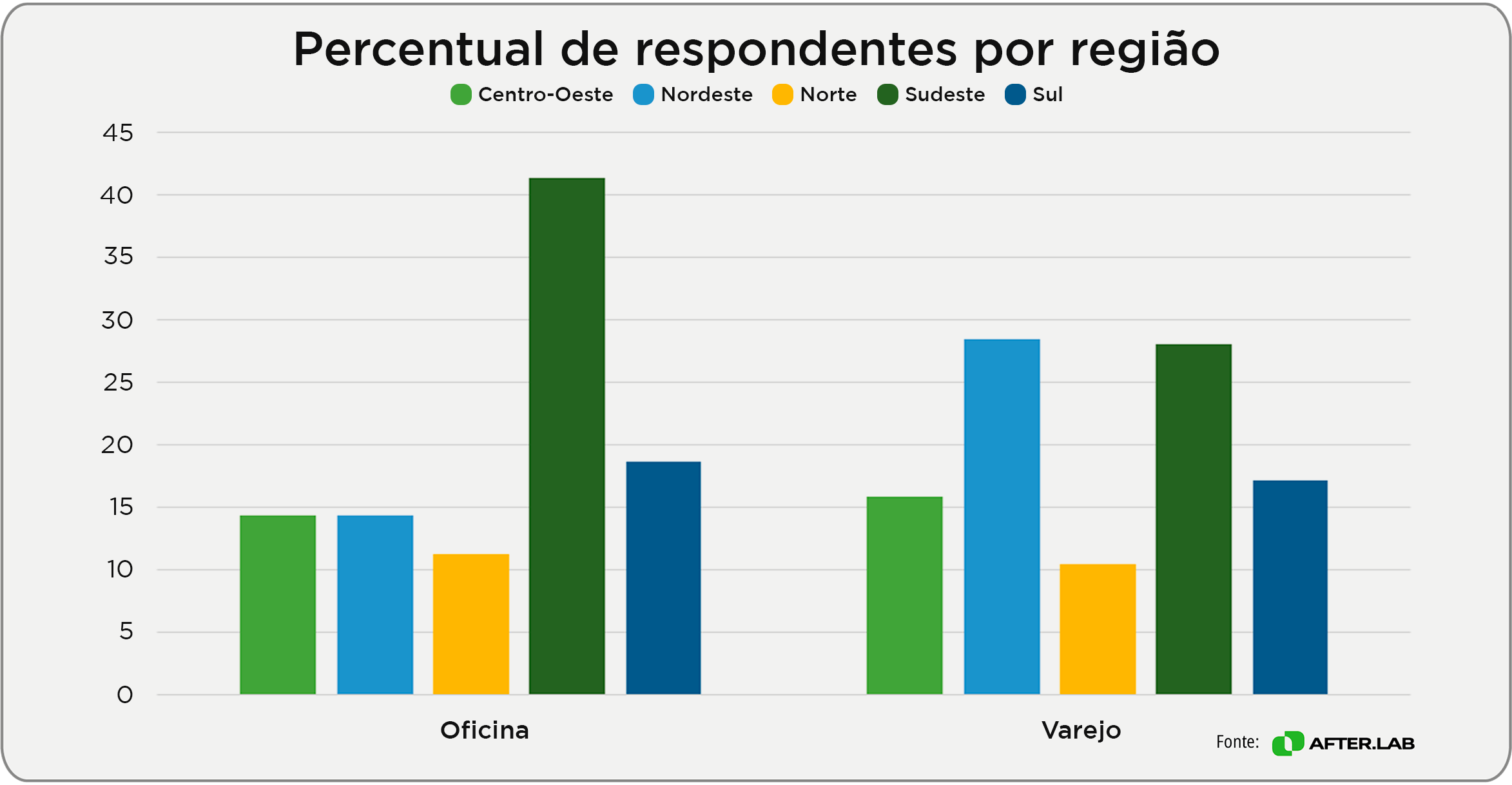 O gráfico e a tabela a seguir se referem aos entrevistados. No gráfico temos as divisões percentuais totais e por região e, na tabela, você encontra o número de entrevistas realizadas. Observamos que o maior número de entrevistados reside na região Sudeste, o que é pertinente, uma vez que o processo de amostragem considera a participação da região no PIB. A tabela 1 reúne a estatística descritiva de todas as variáveis analisadas e é importante para entender o comportamento destas ao longo da série temporal estudada. Cabe ressaltar que as perguntas feitas para as oficinas são referentes ao uso, enquanto as perguntas feitas ao varejo são referentes à venda dos produtos citados. No varejo, há maior discrepância entre a média e a mediana, evidenciando o impacto de grandes volumes consumidos por poucos estabelecimentos. Já nas oficinas, as médias estão mais próximas das medianas, sugerindo menor influência de grandes consumidores.