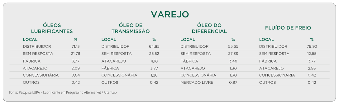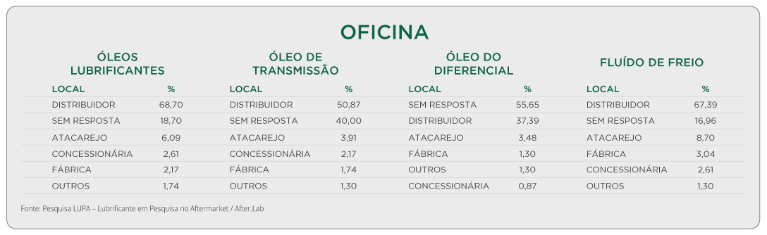 As tabelas a seguir indicam onde os respondentes das oficinas e do varejo costumam comprar os óleos que utilizam e comercializam, respectivamente. Nas oficinas, vemos que o principal fornecedor é o distribuidor, seguido dos atacarejos. No varejo, também observamos domínio das distribuidoras, seguidas pelas fábricas para os óleos de motor, óleo diferencial e fluido de freio, e dos atacarejos para os óleos de transmissão.