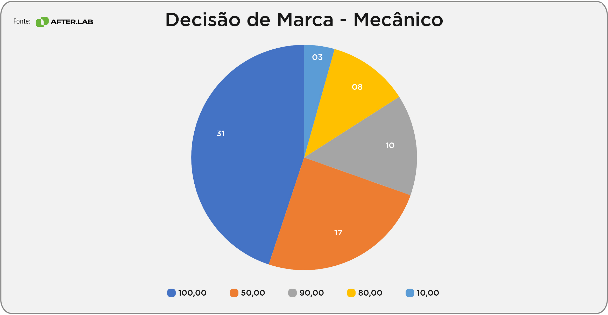 Uma das novidades oriundas da atualização da pesquisa LUPA diz respeito ao entendimento de quem decide qual marca de óleo lubrificante será usada no momento da manutenção do automóvel. Conforme o gráfico, vemos que 31% das oficinas entrevistadas indicam que essa decisão é tomada pelo mecânico em 100% dos casos e 17% indicaram que, em metade dos casos a decisão é tomada pelo mecânico e na outra metade, pelo dono do carro.