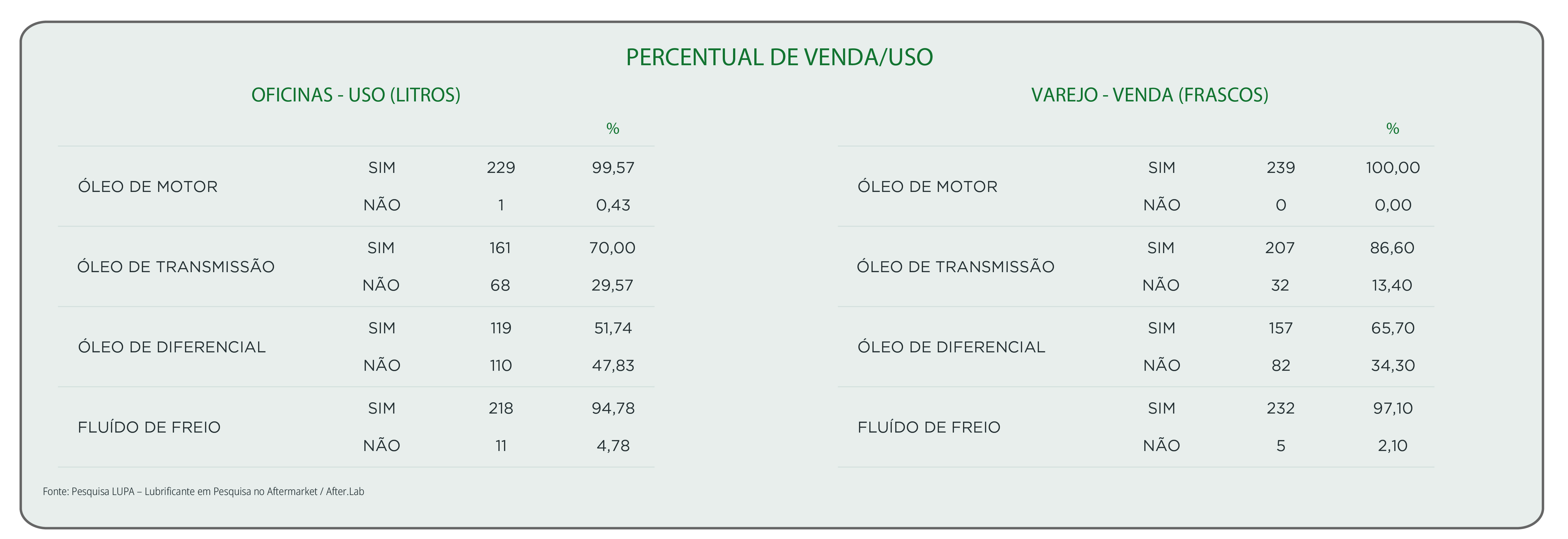 A tabela a seguir nos traz informações acerca do percentual de respondentes que vendem ou fazem uso dos produtos analisados. É observado que à medida que há a especialização do lubrificante, menos respondentes trabalham com tais produtos. Essa tabela também corrobora os resultados de vistos nos gráficos 2 e 3, publicados nas edições anteriores e disponíveis para consulta no site, uma vez que quanto menor o número de respondentes trabalhando com determinado lubrificante, menor será o volume comercializado.