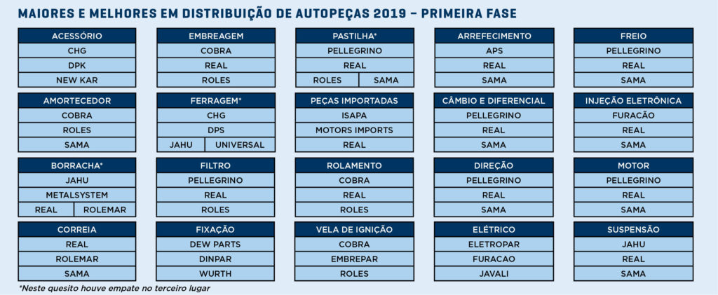 Desde 1996, o jornal Novo Varejo vem balizando o desempenho empresarial dos distribuidores de autopeças a partir da opinião de seus principais clientes, os varejistas de componentes automotivos. O estudo apura a percepção e a satisfação dos empresários ou profissionais responsáveis pelas compras nas lojas quanto aos produtos e serviços oferecidos por seus principais fornecedores. O estudo é dividido em duas fases. Para a conclusão da primeira, 500 varejistas de autopeças para veículos leves de todo o país foram entrevistados por telefone entre os meses de janeiro e março de 2019 e convidados a avaliar os distribuidores a partir da segmentação por produtos e sistemas automotivos, levando em conta parâmetros como disponibilidade e qualidade do portfólio.