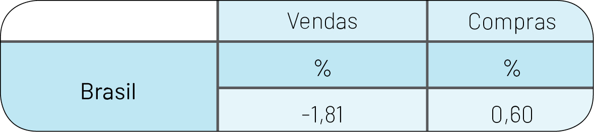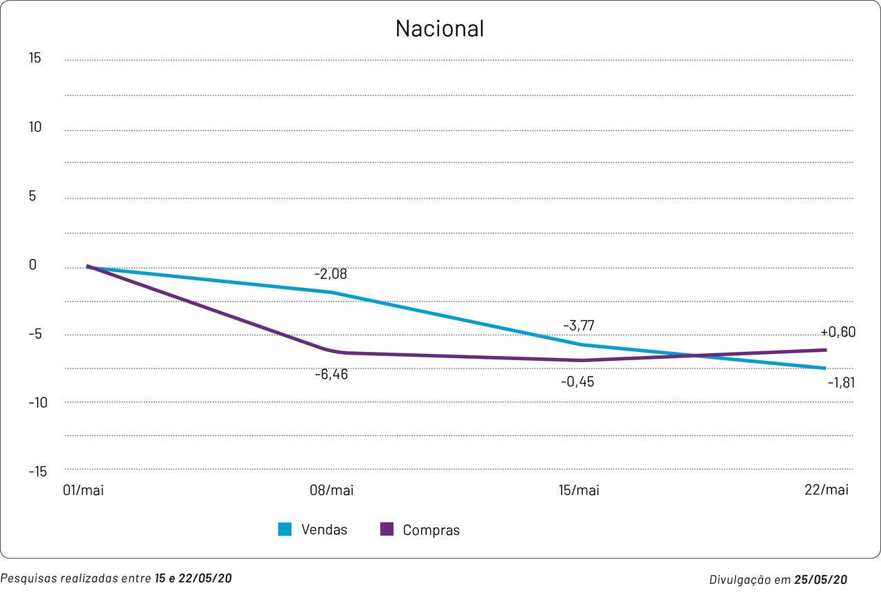E os números nacionais que achamos para os negócios na semana de 18 a 22 de maio foram os seguintes: 1,81 ponto percentual negativo nos resultados de venda dos varejistas e 0,60 positivos em compras. Assim como na semana anterior, o mercado voltou a indicar estabilidade em seus resultados na ponta de venda e de compra.