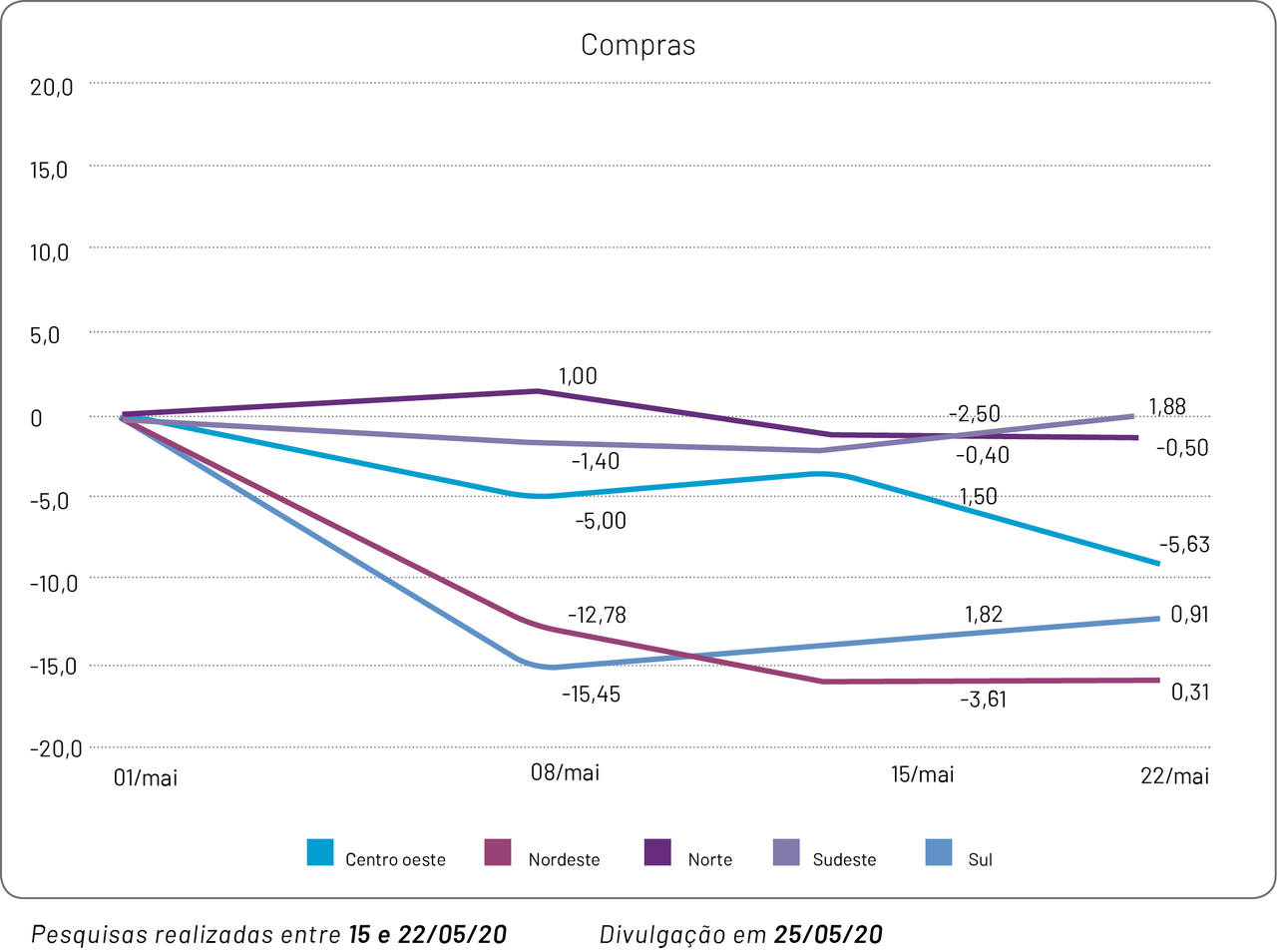 Do Centro-Oeste, região que ostentava os melhores resultados do varejo no país, veio pela primeira vez a notícia de estabilidade no patamar de vendas, – 0,63%, o que termina não sendo uma má notícia, já que os números das semanas anteriores foram os mais positivos que encontramos nessas pesquisas. Já as compras na região caíram mais, – 5,63%, mostrando assim que as vendas não ampliadas fizeram as compras serem recuadas.