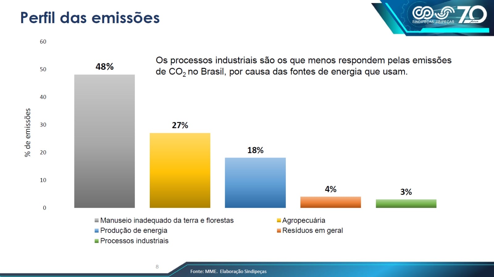 Após detalhar todas as rotas tecnológicas que os veículos terão no Brasil em favor da descarbonização – combustíveis fósseis, biocombustíveis, eletrificados e célula a combustível – o presidente do Sindipeças lembrou que os processos industriais são os que menos emitem CO2 no país. “Há outros que emitem muito mais. Precisamos trabalhar neles. Por exemplo, o manuseio inadequado de terra e florestas é responsável por praticamente metade da emissão de CO2 no Brasil”.
