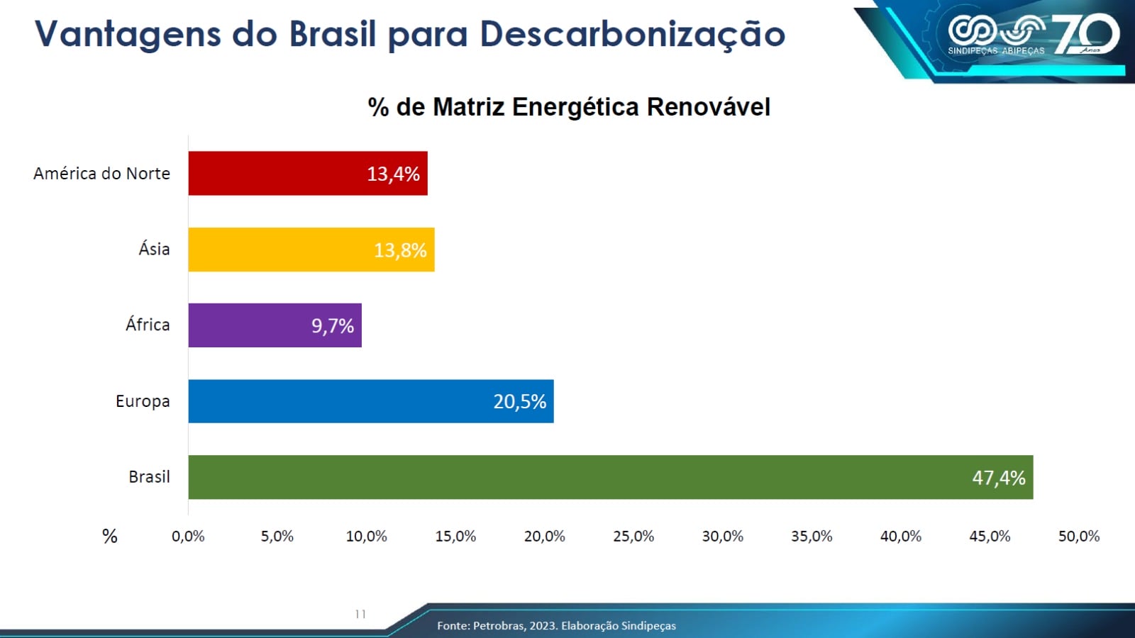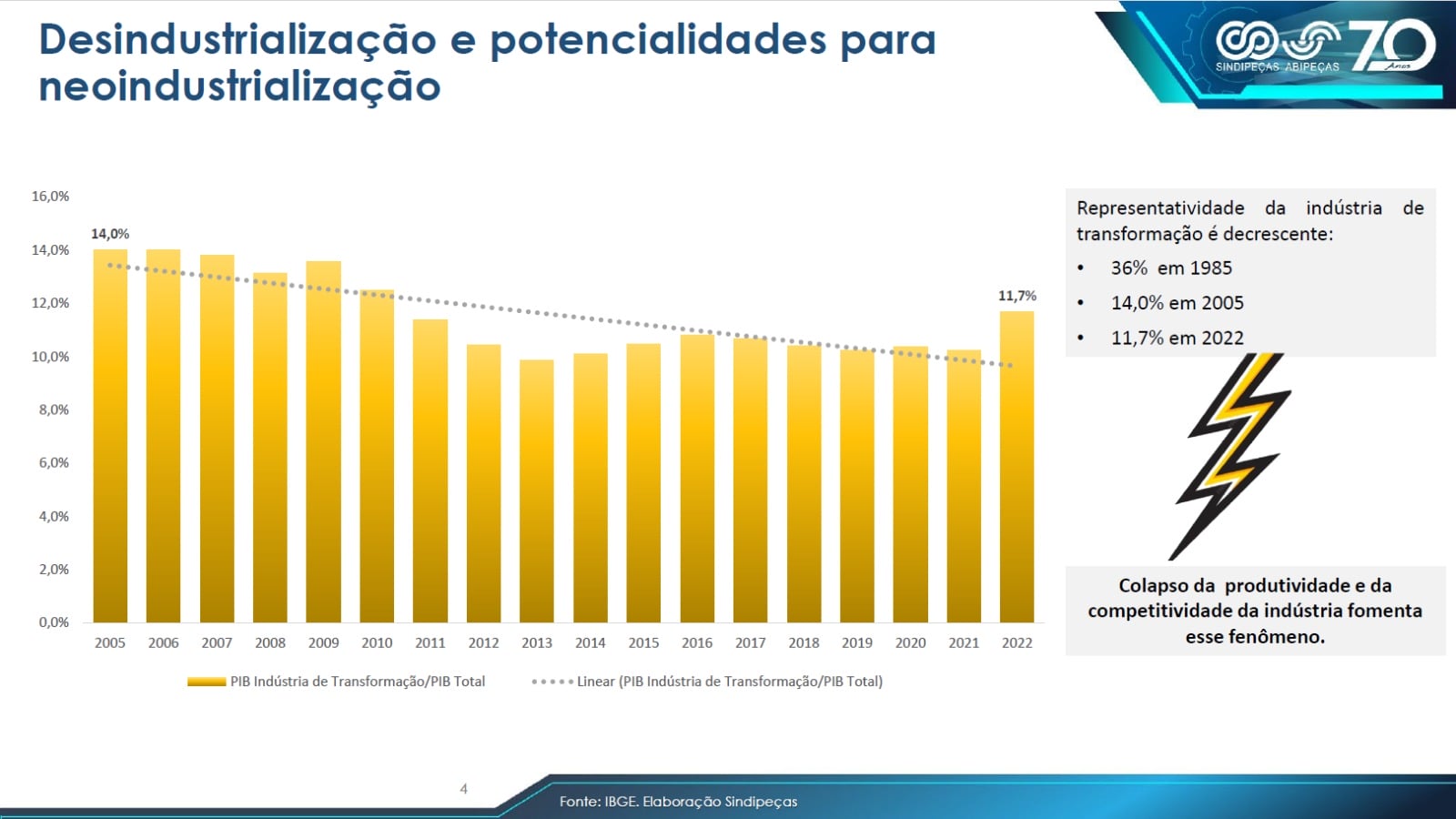 A redução da importância do setor industrial acabou resultando em perda de produtividade e competitividade. “Nós temos desafios e oportunidades. Temos que falar, ao mesmo tempo, em indústria 4.0, descarbonização, veículos elétricos, outras mobilidades e desenvolvimento de novos combustíveis, em que o Brasil está na frente em relação ao mundo. Nossos biocombustíveis são um ativo importantíssimo nessa briga pela descarbonização”.