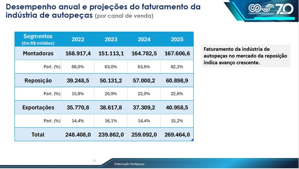 Detalhando o desempenho do setor por canal de vendas, viu-se um crescimento razoável do aftermarket. “A reposição, realmente, tem um destaque muito especial, tem vindo aqui num crescimento bastante significativo. Quando você deixa de comprar veículos zero, começa a investir no seu usado, fazer manutenção. O setor de reposição tem sido favorecido. E a gente imagina que isso deve continuar nos próximos anos porque a venda de zero não vai normalizar tão cedo. O financiamento é um problema crucial para os carros zero”, finalizou Claudio Sahad, presidente do Sindipeças.