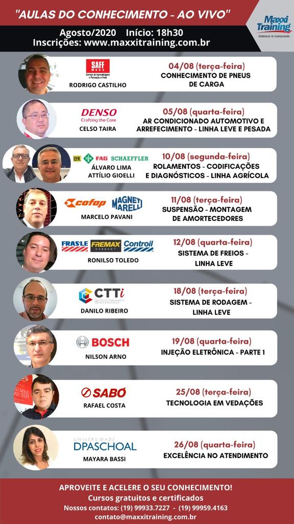 O Maxxi Training, Distribuidor do Conhecimento, em atualização técnica, gestão e atendimento automotivo, promoverá, durante o mês de agosto, aulas online ao vivo para profissionais do setor automotivo dos segmentos de Linha Leve, Linha Pesada, Agrícola e Atendimento, que atuam como gestores, aplicadores, consultores, reparadores e mecânicos. Gratuitas e com certificação eletrônica, as transmissões têm como objetivo fazer com que o público adquira conhecimento e compartilhe suas experiências. Os interessados podem se inscrever pelo link: http://www.maxxitraining.com.br/calendariocursos/. Vale lembrar que os alunos recebem apostilas após os treinamentos.