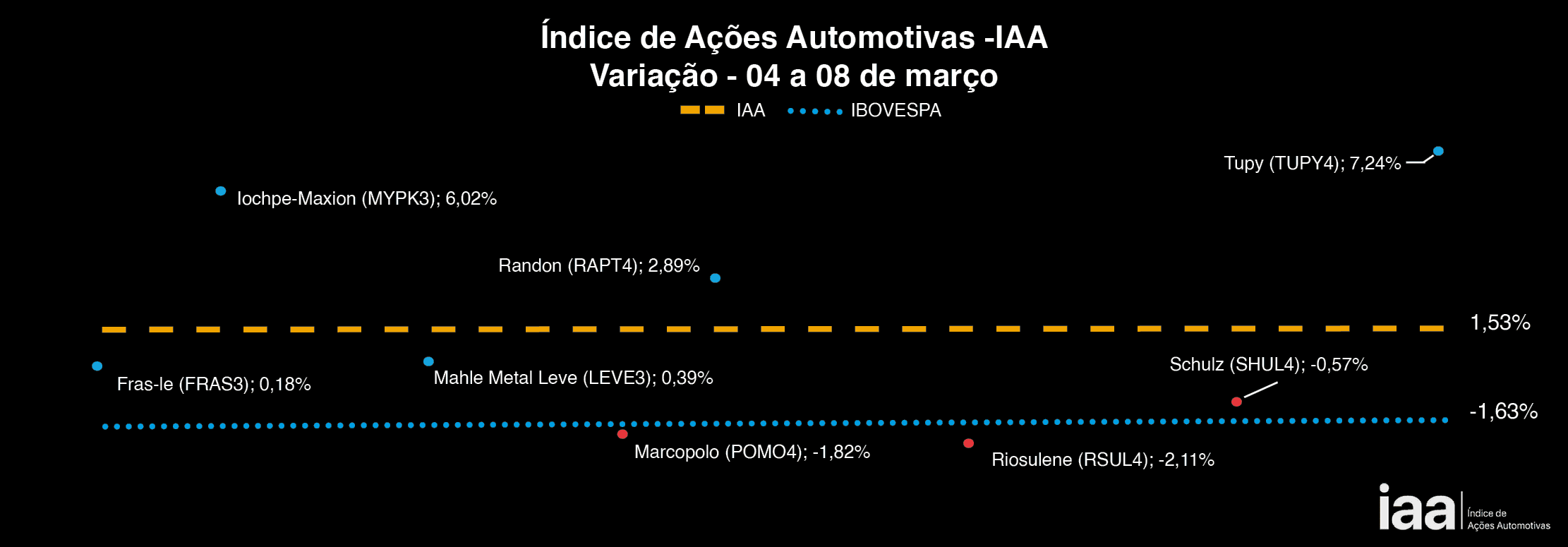No período, o IAA, índice que acompanha as empresas automotivas na Bolsa de São Paulo, foi de 1,53%, superando ao ibovespa que encerrou a semana em queda de -1,63%, reflexo da queda do valor do petróleo em todo o mundo e a questões envolvendo a Petrobras.