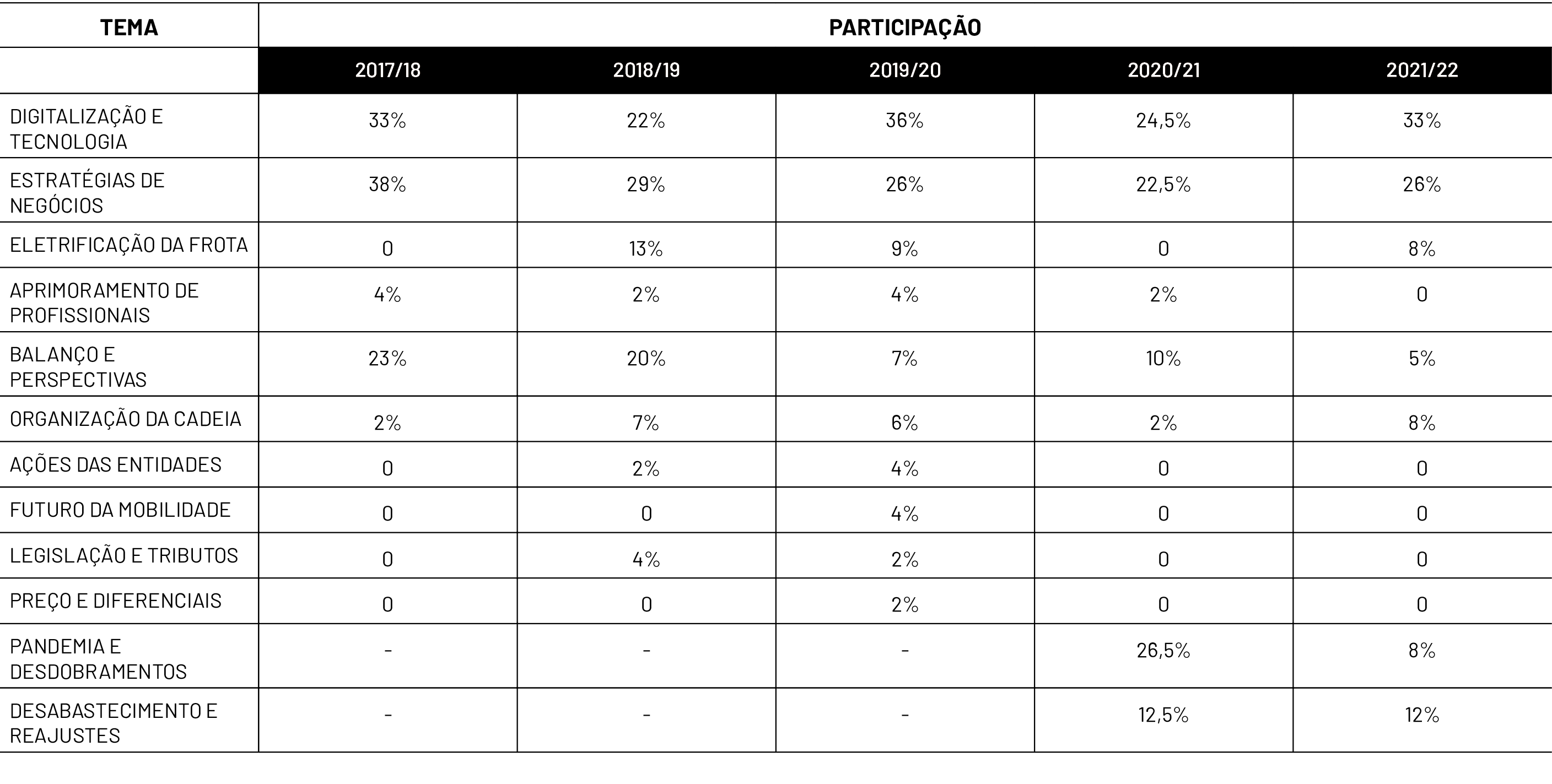 Com isso, a pauta do mercado para 2022 voltou a se acomodar nos assuntos que prevaleciam antes da pandemia, a saber: digitalização e estratégias de negócios. Aliás, na reportagem publicada em janeiro de 2021 já fazíamos esta previsão: “Não devemos, em função desse índice expressivo, relativizar a pauta do setor. Afinal, a crise sanitária vai passar e – assim esperamos – daqui a 12 meses, quando estivermos publicando nas entrelinhas que o grande tema do interesse deste aftermarket é a digitalização do mercado, questão que vem crescendo significativamente nos enunciados das perguntas que encaminhamos aos participantes desta ação”. Foi basicamente o que aconteceu. As perguntas específicas sobre pandemia caíram de 26,5% para 8%. Já o tema digitalização e tecnologia voltou a subir na pauta dos Parceiros Secretos, de 24,5% para 33%, e estratégias de negócios – assunto que sempre teve índices expressivos de participação – subiu de 22,5% para 26%. O quadro a seguir apresenta a distribuição dos assuntos tratados nesta reportagem e um comparativo com edições anteriores do Parceiro Secreto. Você vai notar também que o número de assuntos trazidos pelos participantes vem caindo, o que mostra que o mercado está focado em temas específicos, sendo que a digitalização é o que mais aflige – basta ver o quanto a questão vem dominando debates e eventos desde a última Automec, em 2019.