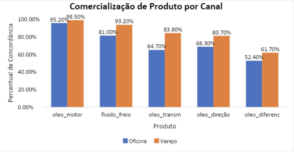 Interessante notar que existe uma proporção entre as quantidades comercializadas nas oficinas e nos varejos, sendo 1,7 vezes maior em óleo de motor e óleo de diferencial, 1,8 vezes em óleo de direção, o dobro em fluído de freio, e 1,2 vezes em óleo de transmissão.