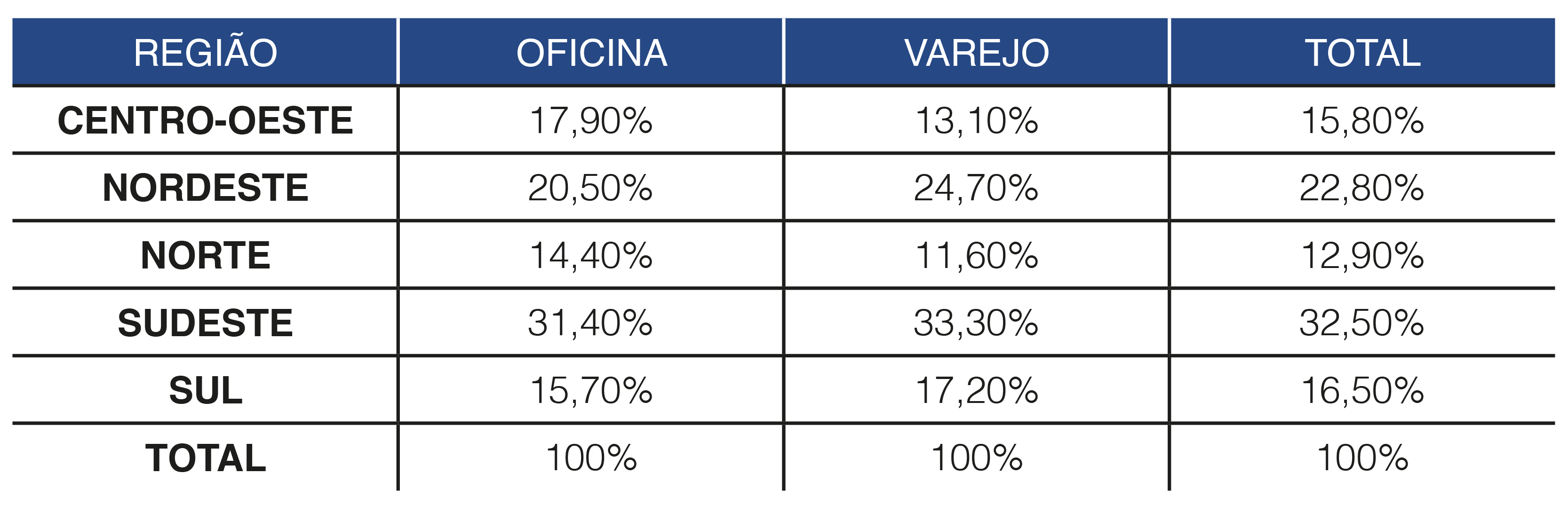 A partir desta edição apresentaremos mensalmente os resultados das novas pesquisas META – Montadoras em Estatísticas e Tendências no Aftermarket e LUPA – Lubrificantes em Pesquisa no Aftermarket Automotivo relativos ao primeiro semestre de 2023. Os estudos são realizados pelo AfterLab, a empresa de pesquisas e inteligência de negócios do aftermarket automotivo brasileiro. Na estreia, trazemos in formações inéditas e exclusivas sobre o mercado de lubrificantes a partir dos dados apurados pela pesquisa LUPA . A coleta dos dados foi realizada por telefone de 17 de janeiro e 30 de junho deste anos. A amostra é estatisticamente representativa e balanceada considerando PIB, distribuição de varejos e oficinas e frota circulante. Foram realizadas 496 entrevistas válidas, sendo 267 varejos (53,8%) e 229 oficinas.