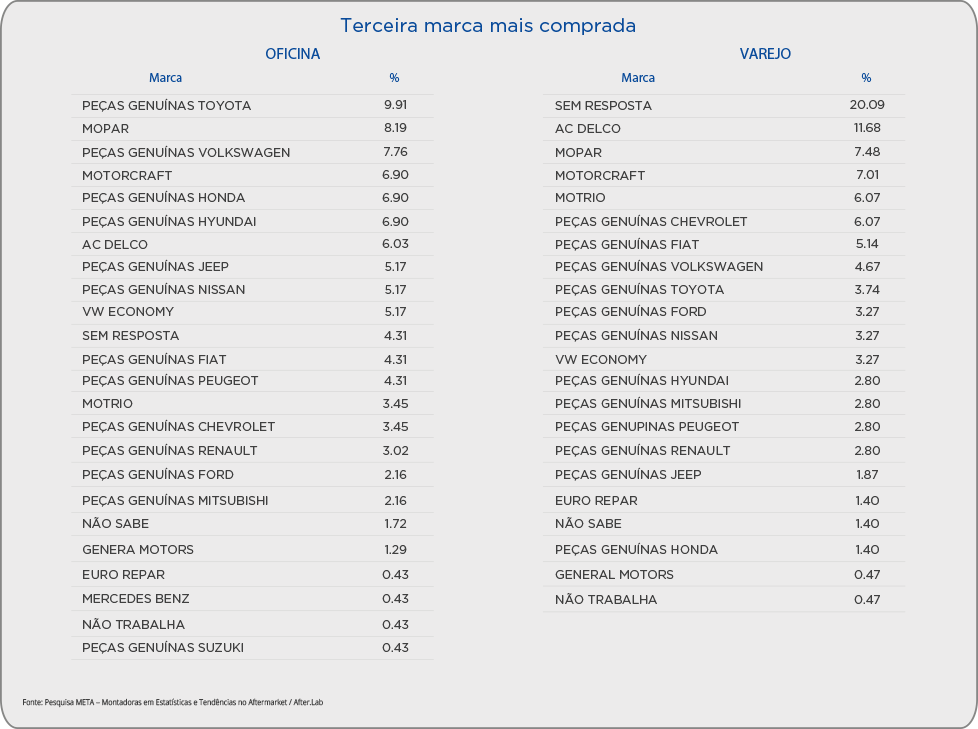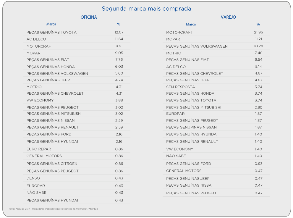 Em continuidade ao questionário aplicado aos entrevistados de ambos os segmentos de negócios, os pesquisadores do After.Lab, o núcleo de inteligência de negócios do mercado, também investigaram a segunda e a terceira marca genuína preferida. Enquanto Mopar e ACDelco lideraram as compras como primeiras opções, agora surgem em destaque produtos para os automóveis Toyota e Ford (Motorcraft). Os resultados completos – relativos ao segundo semestre de 2024 – você confere nas tabelas a seguir.