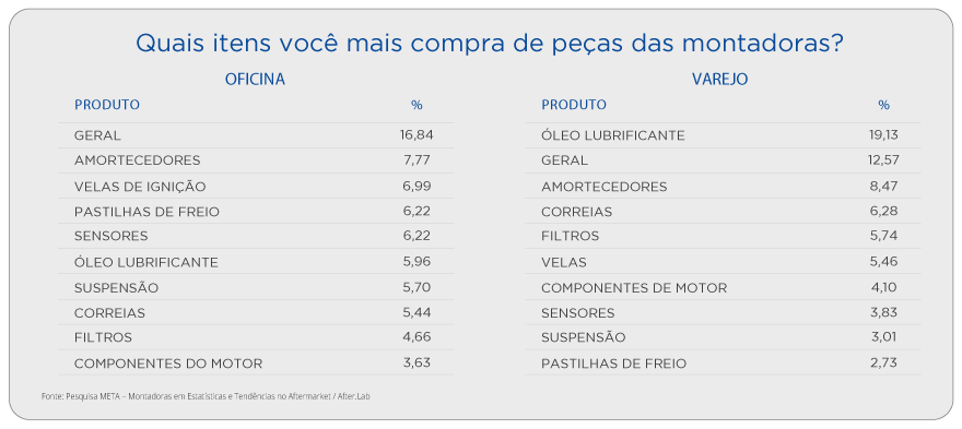 A lista de peças genuínas de montadoras mais compradas, indicada na tabela a seguir, é diversa e, por isso, citaremos apenas os 10 itens que lideram o consumo. Nas oficinas, os itens mais comprados são enquadrados na categoria GERAL, seguida pelos amortecedores, enquanto no varejo, os óleos lubrificantes assumem o topo da tabela, ficando os itens classificados como GERAL na segunda colocação.