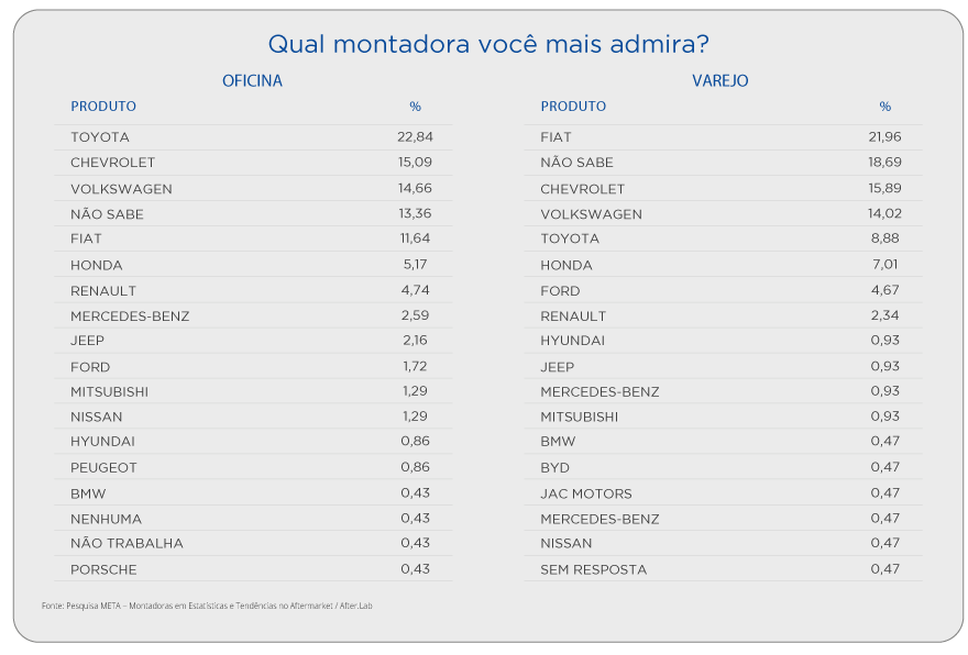 Os entrevistadores do After.Lab também perguntaram a varejistas e reparadores quais as montadoras que mais admiram, resultando no ranking apresentado pela tabela a seguir.