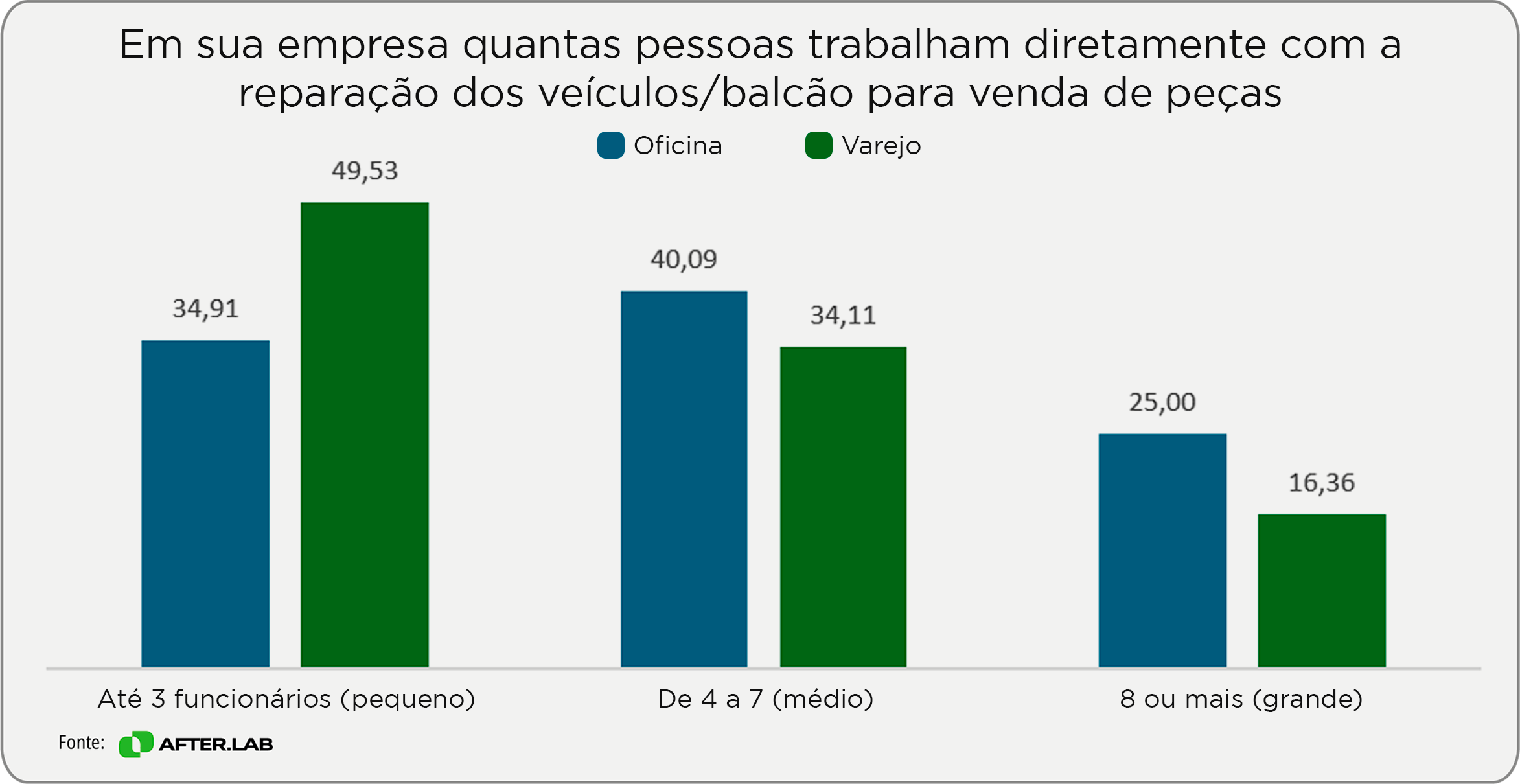 Por fim, como informação complementar, a pesquisa META apurou o porte das empresas entrevistadas segundo o número de profissionais dedicados à reparação dos veículos e ao atendimento no balcão, respectivamente. A classificação é feita como segue: até 3 funcionários = pequeno; 4 a 7 funcionários = médio; 8 ou mais funcionários = grande.