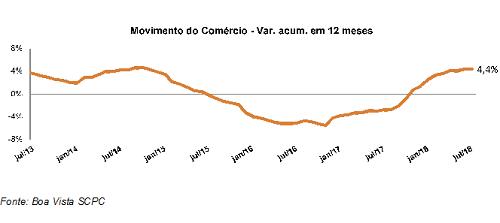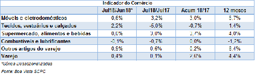 O Indicador Movimento do Comércio, que acompanha o desempenho das vendas no varejo em todo o Brasil, subiu 0,4% em julho na avaliação mensal dessazonalizada, de acordo com os dados apurados pela Boa Vista SCPC. No acumulado em 12 meses, o indicador avançou 4,4% (agosto de 2017 até julho de 2018 frente ao mesmo período do ano anterior). Já na avaliação contra julho do ano anterior o varejo permaneceu estável.