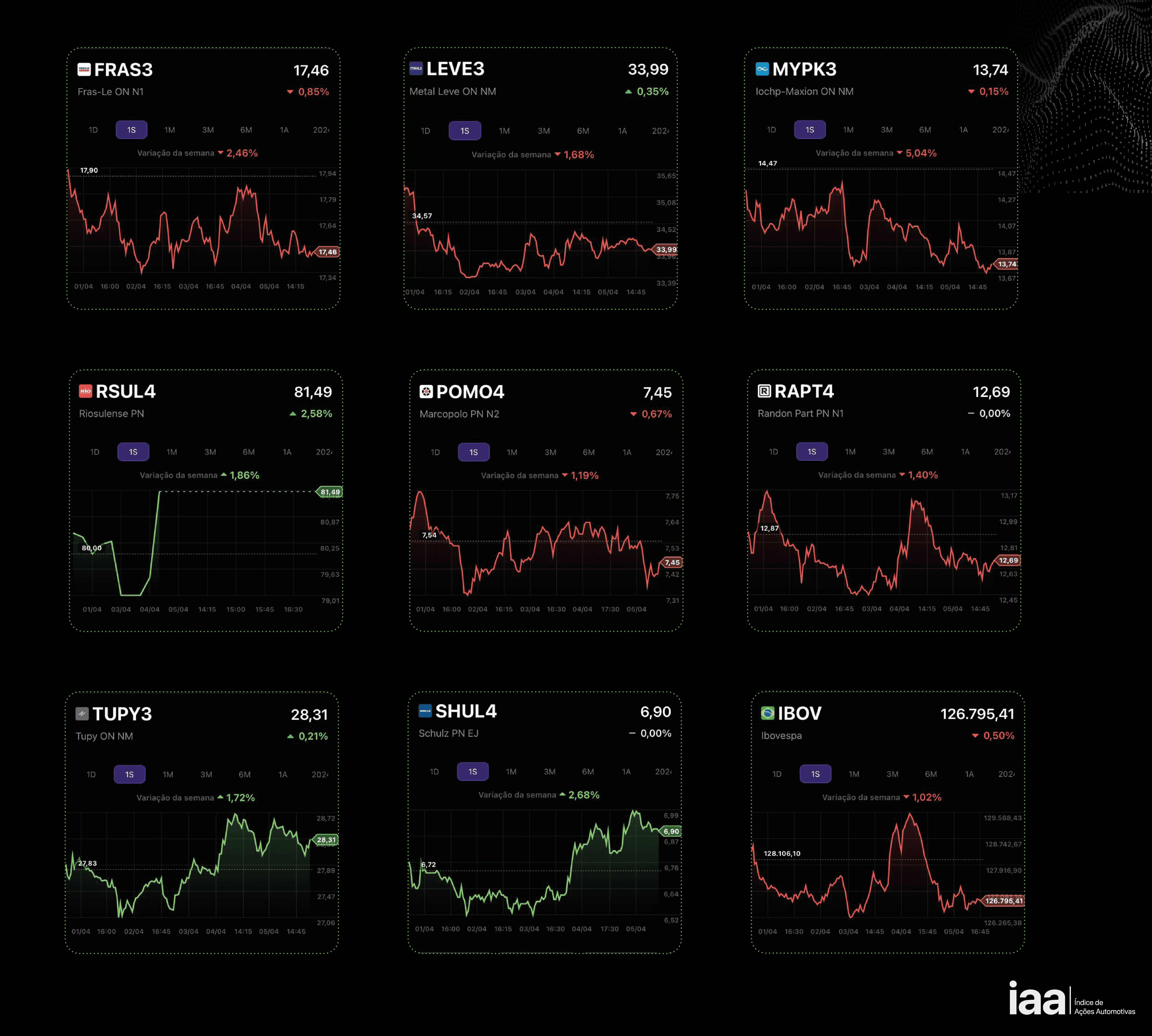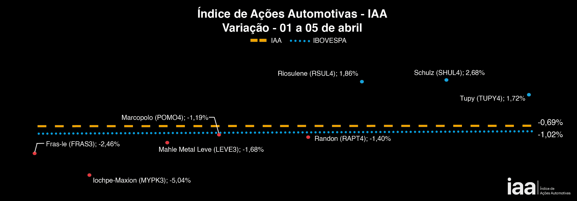 A primeira semana de abril rompeu uma temporada de valorização das ações automotivas negociadas na Bolsa de Valores de São Paulo. Após uma sequência de saldos positivos, o IAA, índice que mede o desempenho desses títulos, encerrou o período com variação negativa de -0,69%.