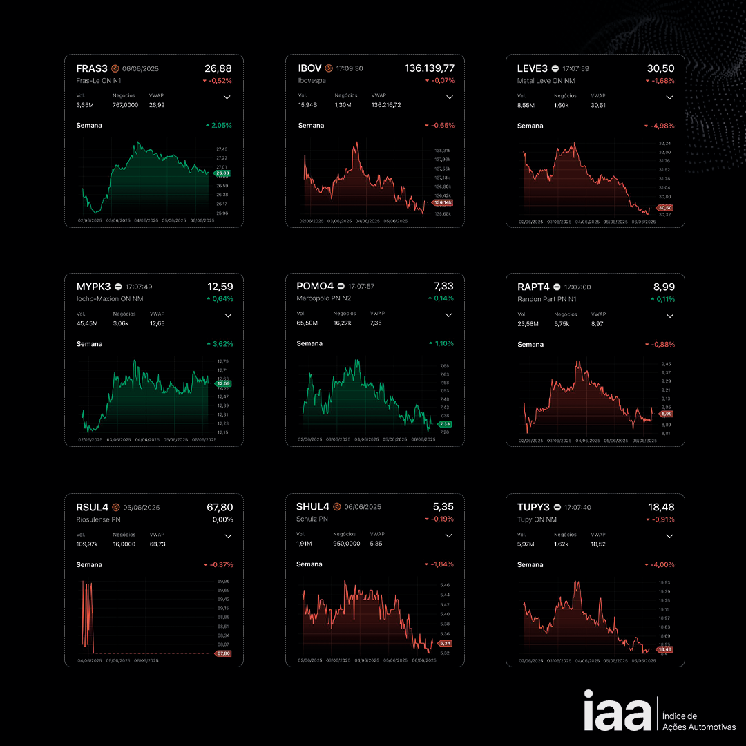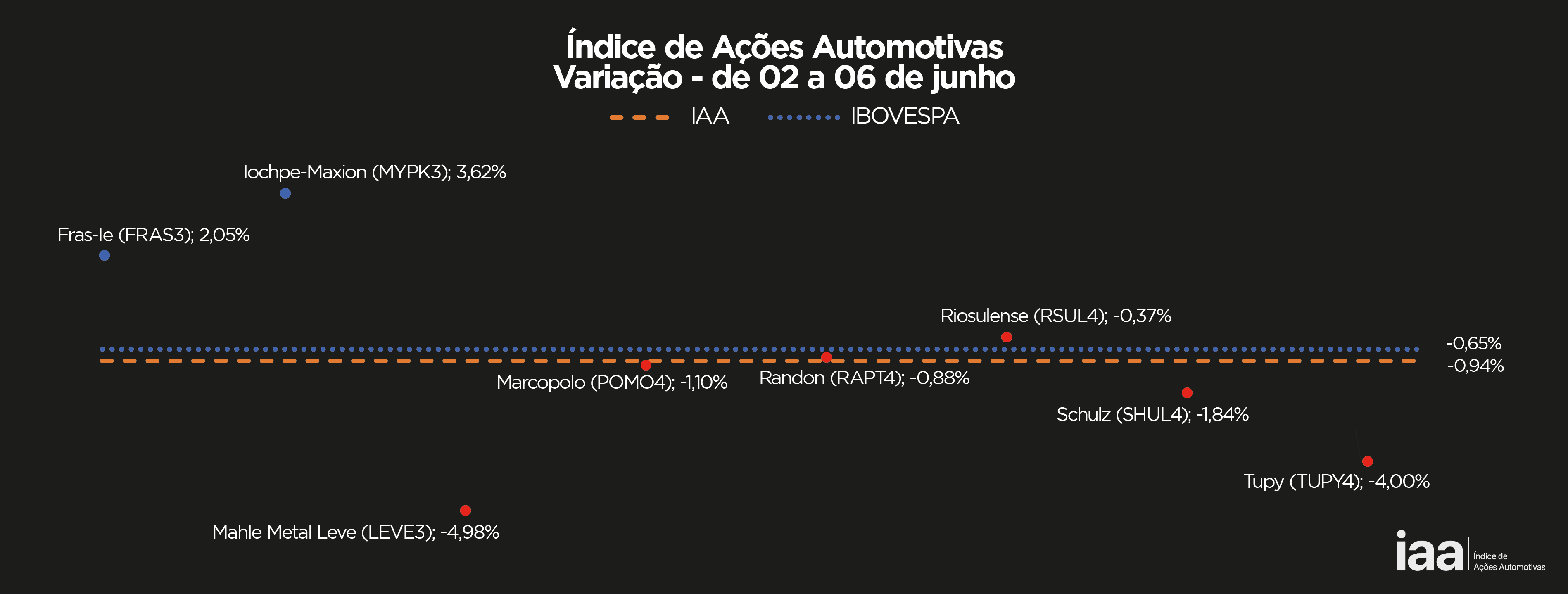 O IAA é o índice criado pelo After.Lab para medir as movimentações nas ações das empresas do setor automotivo listadas em Bolsa. Mesmo que ainda sejam poucas as empresas a operar nessa modalidade, já são suficientes para proporcionar uma leitura sobre o desempenho das operações relacionadas ao universo automotivo que abriram capital e usam o pregão do Ibovespa para conquistar investidores e alavancarem seus negócios.