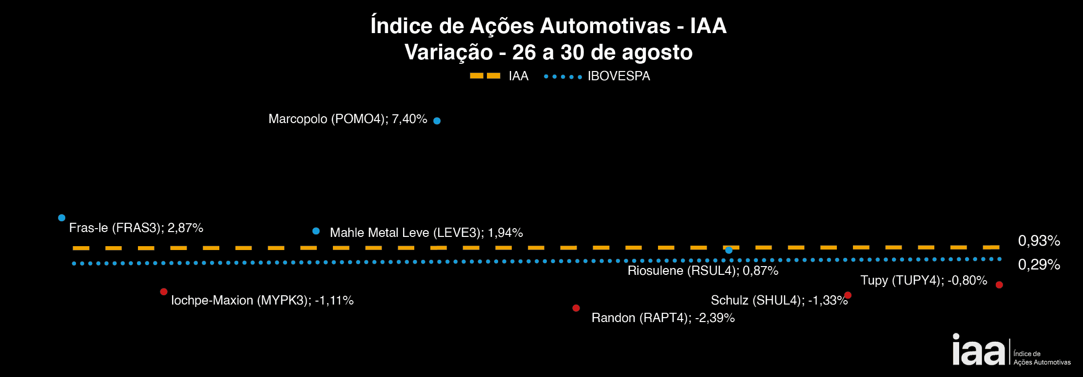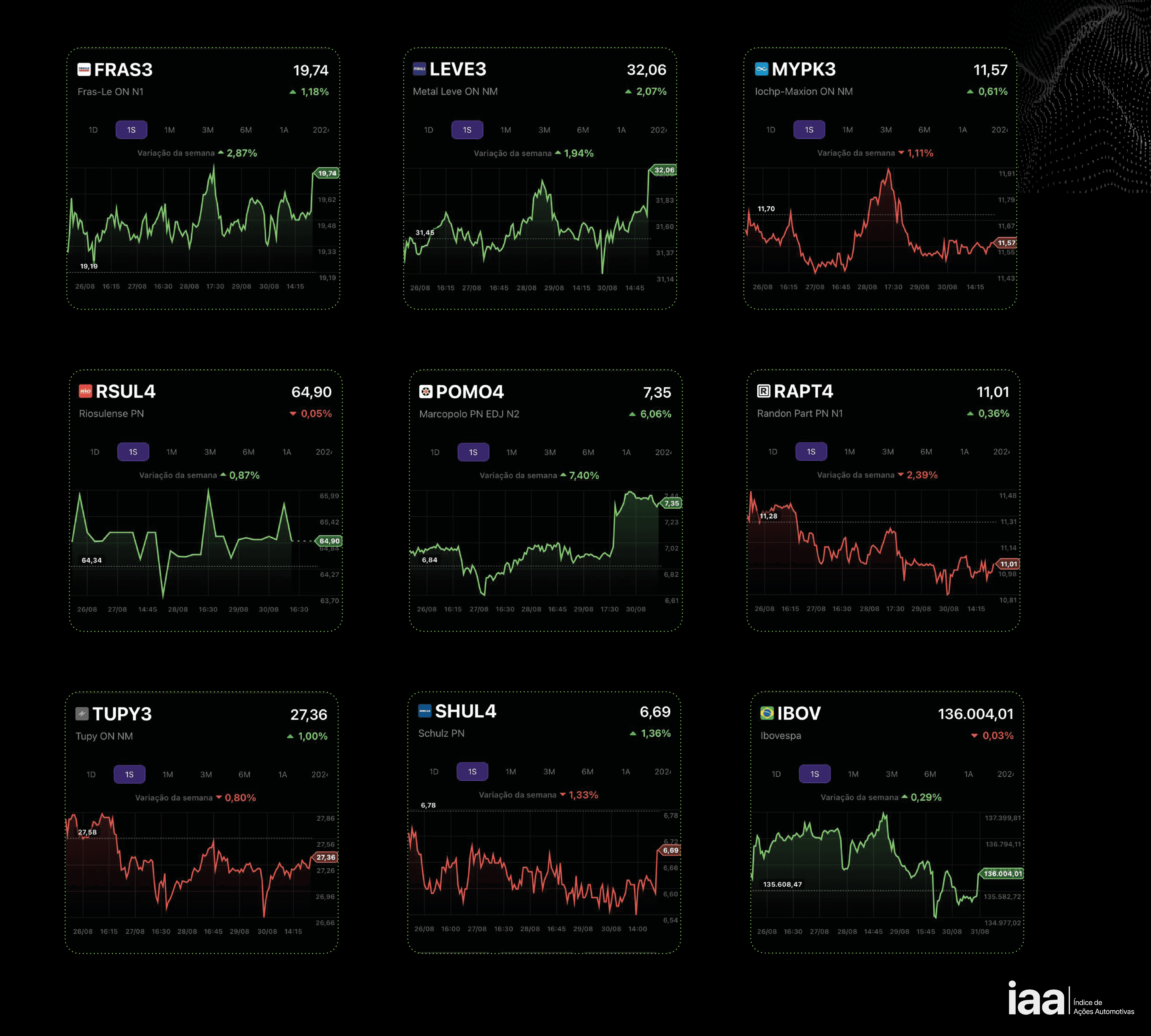 Na semana, o melhor desempenho foi o das ações da Marcopolo (OPOMO4) +7,40%, seguidas pela Fras-le (FRAS3) +2,87%; Mahle Metal Leve (LEVE3) +1,94% e Riossulense (RSUL4) +0,87%.