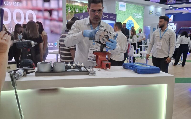 Bancada com ferramentas para demonstrações de montagem e desmontagem de rolamentos de forma simples e prática foi destaque no estande – Rafael Braga, técnico da NTN, compartilhou parte de sua experiência com diversas dicas para um correto manuseio de rolamentos, e fez várias apresentações diárias que atraíram público ao o estande para assistir a montagem e desmontagem de um rolamento de primeira geração do cubo de roda Para isso, foi utilizado o kit de ferramentas desenvolvido em parceria com a CLAS, e que agora chega ao mercado brasileiro, trazendo mais segurança, eficiência, qualidade e redução do tempo do reparo. O conjunto da marca europeia conta com extrator de anel elástico, extrator hidráulico, vários acessórios em formato de cunha e seu fuso extrator, além de outras ferramentas especialmente concebidas para a manutenção automotiva. O lançamento do Kit de Desmontagem Universal de Rolamentos conta com variedade de dimensões para atender diversos modelos de veículos. “Com ferramentas apropriadas, o mecânico consegue fazer a manutenção sem tirar a manga de eixo do carro, ganhando, assim, tempo. Além disso, sem as ferramentas adequadas, o rolamento pode ser danificado na montagem e não ter a performance que deveria”, explica Rafael. Outra vantagem das ferramentas especiais e de não retirar a manga do carro, é a mínima interferência no alinhamento das rodas, aumentando a agilidade do reparo.