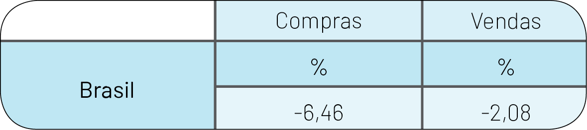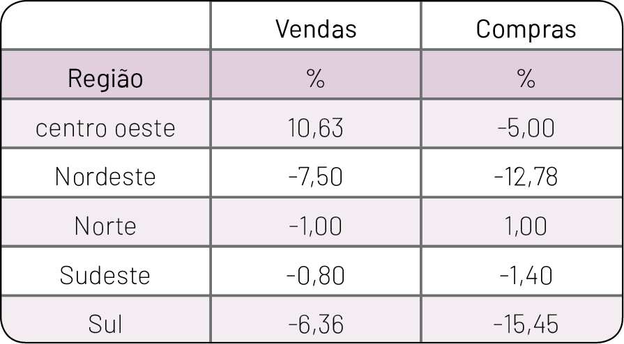 E ficou para o Sudeste e para o Norte a taxa de menor variação entre compra e venda, apenas 2,2% e 2% respectivamente de variante entre o percentual vendido e o comprado, número que reflete uma estabilidade entre as pontas dos negócios dos varejistas da região.