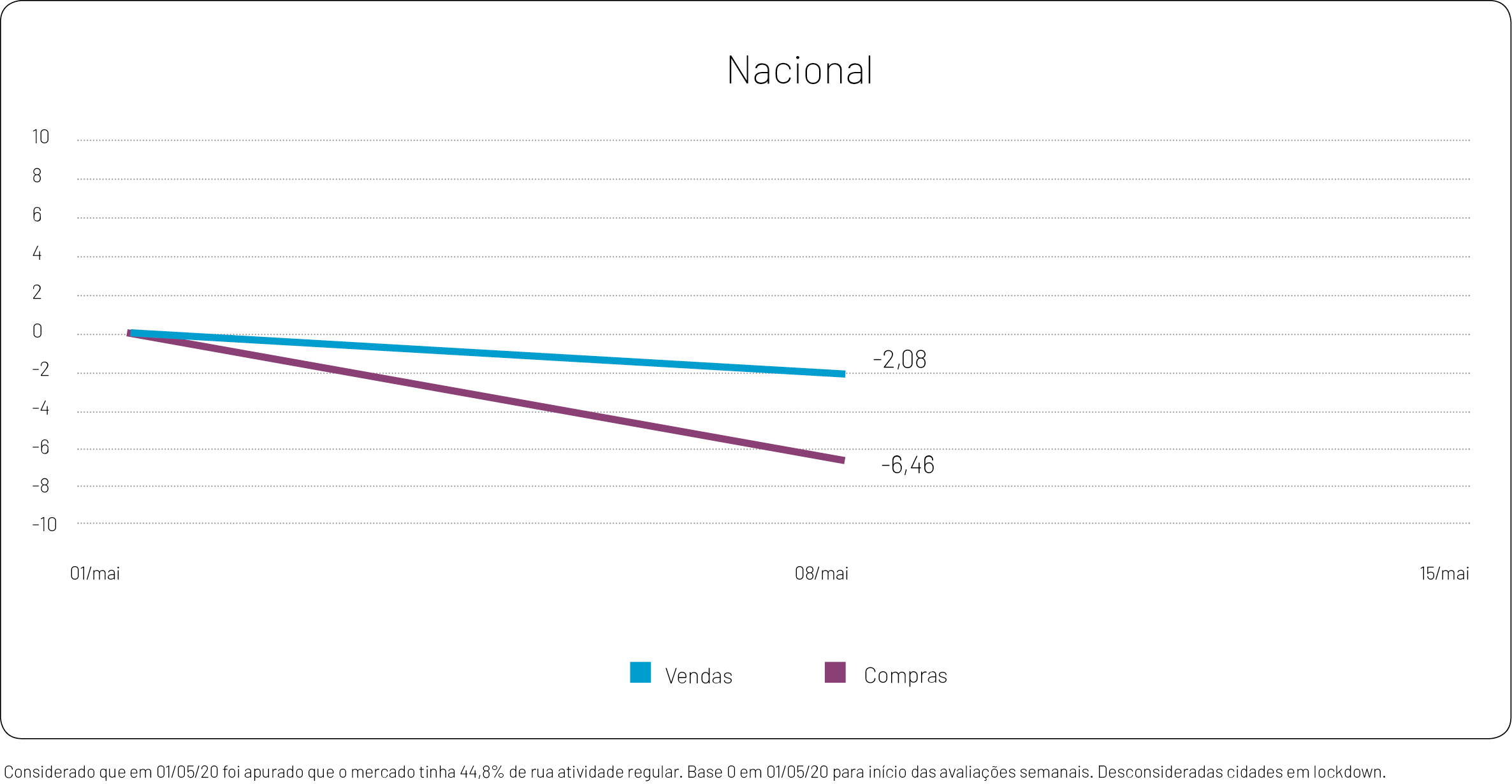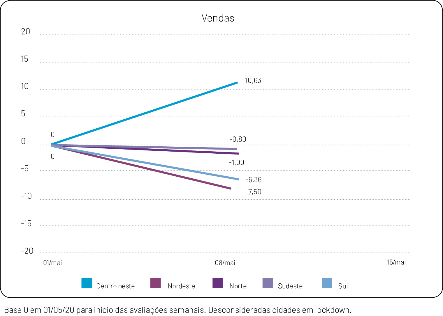 No quadro de vendas vemos Norte e Sudeste oscilando ligeiramente para baixo, cerca de 1%, enquanto Sul e Nordeste cairão 6,36% e 7,50%, respectivamente. Vindo então a surpresa positiva da pesquisa no Centro-Oeste, que já tinha a posição de melhor região do país no estudo referencial inicial, ampliando a sua recuperação, crescendo mais 10,63% suas vendas, segundo comparação com igual período da semana anterior.