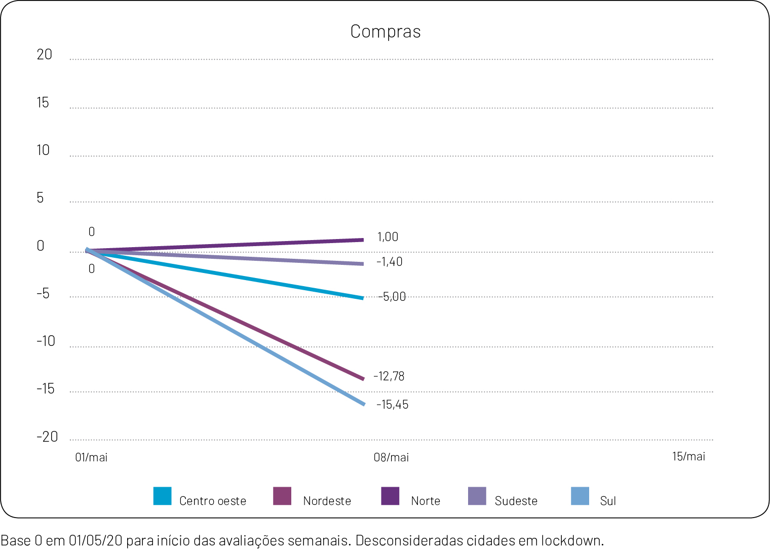 Já em compras, vemos um quadro ainda mais depressivo, em que em todas as regiões do país os varejos compram menos do que compraram no mesmo período da semana anterior, exceto no Norte onde houve uma oscilação positiva insignificante, apenas 1%.