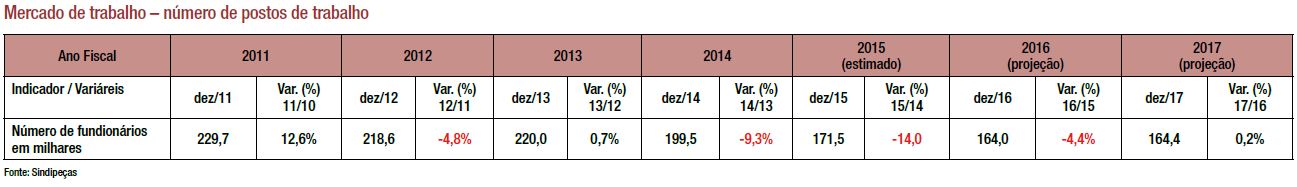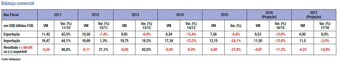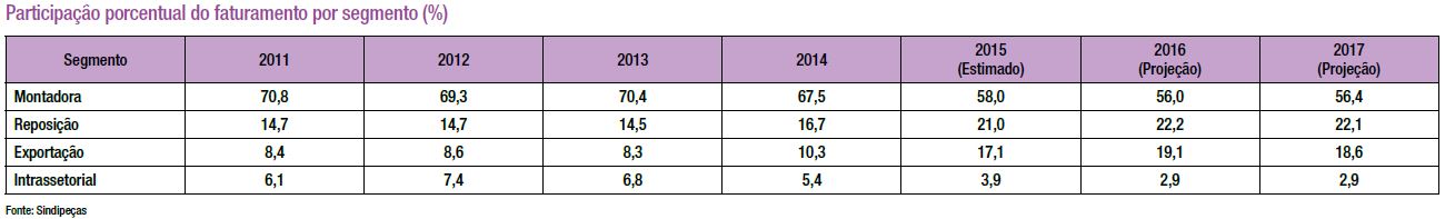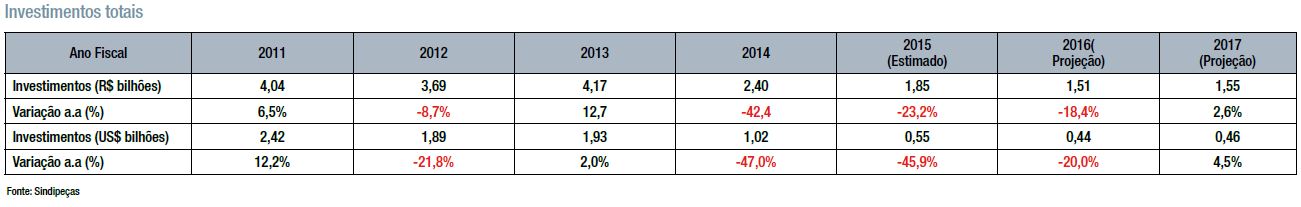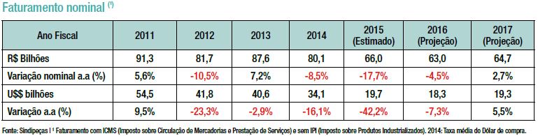 O Sindipeças projeta faturamento nominal da ordem de R$ 63 bilhões este ano, com queda de 4,5% sobre o registrado no ano anterior. Espera-se pequena recuperação em 2017, de 2,7%, com faturamento nominal de R$ 64,7 bilhões. O volume previsto de investimentos em reais é de R$ 1,51 bilhão este ano, 18,4% menor que o registrado em 2015. Em 2017 pode haver leve crescimento, da ordem de 2,6%, após sucessivas quedas, segundo levantamento da entidade.