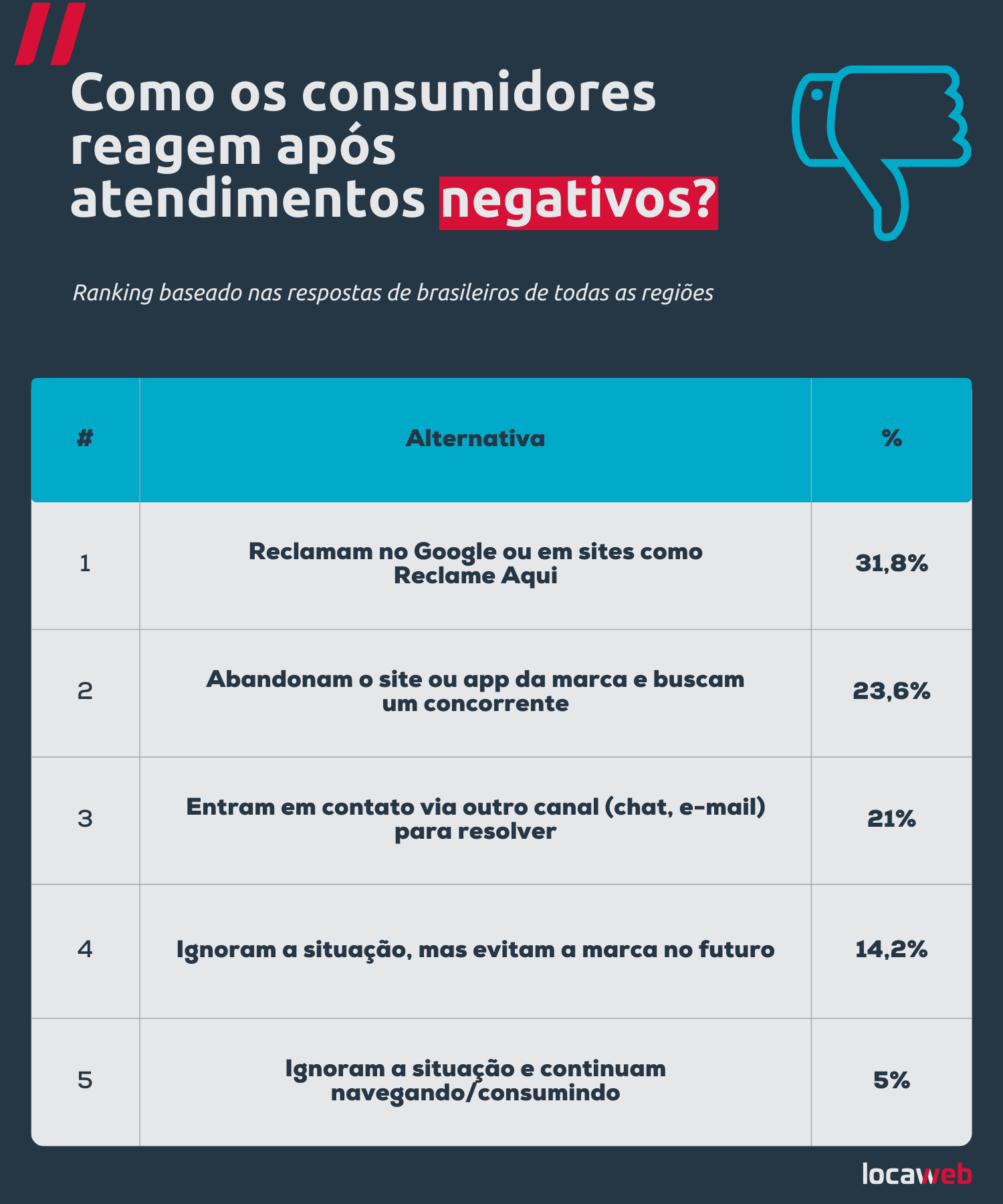 Diante desse tipo de frustração, vale dizer, a reação costuma ser imediata — e nem sempre silenciosa. Para se ter uma ideia, quando são mal atendidos na internet, parte dos entrevistados afirmaram registrar a insatisfação em avaliações públicas, como no Google ou em plataformas como o Reclame Aqui (31,8%), enquanto outros abandonam o site ou aplicativo da empresa e buscam um concorrente (23,6%).