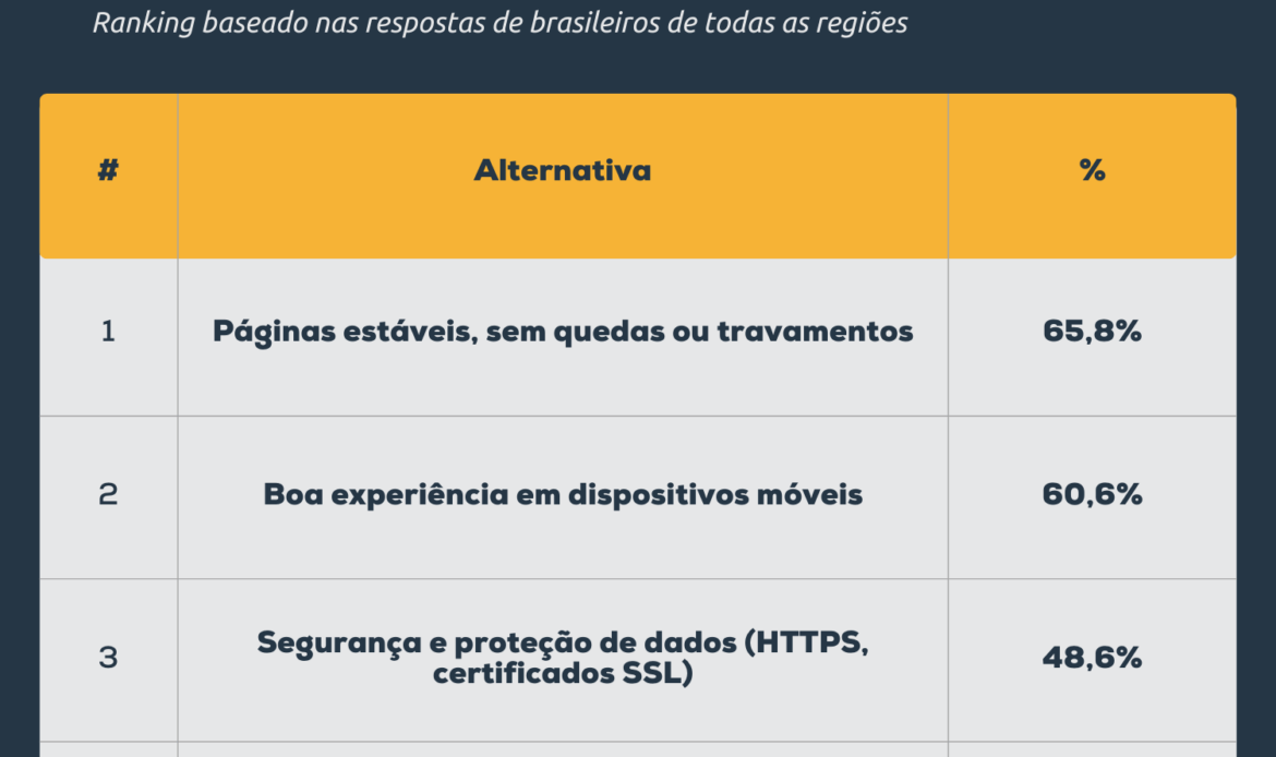 Para os entrevistados, por exemplo, sites estáveis, sem quedas ou travamentos, são indispensáveis ao buscar suporte (65,8%), assim como páginas bem adaptadas a dispositivos móveis (60,6%) — reflexo de um público acostumado a resolver demandas pelo celular. Questões ligadas à segurança também pesam nesse momento: a proteção de dados, validada por protocolos como HTTPS e certificados SSL, foi citada por quase metade dos respondentes (48,6%).