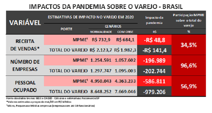 Na projeção, segmentada por porte dos estabelecimentos varejistas, mostra que as empresas terão queda na receita de vendas de R$ 141 bilhões. Desse montante, a redução de R$ 48,8 bilhões na receita de vendas partirão das micros, pequenas e médias empresas (MPEs), aquelas com até 19 funcionários.