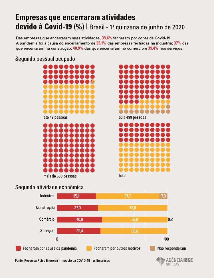 Entre 1,3 milhão de empresas que na primeira quinzena de junho estavam com atividades encerradas temporária ou definitivamente, 39,4% apontaram como causa as restrições impostas pela pandemia do novo coronavírus. Esse impacto no encerramento de companhias foi disseminado em todos os setores da economia, chegando a 40,9% entre as empresas do comércio, 39,4% dos serviços, 37,0% da construção e 35,1% da indústria.