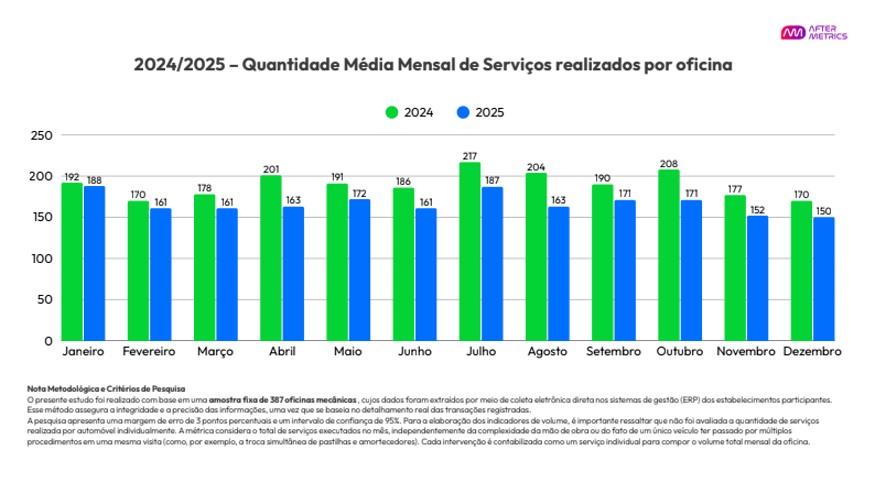 2. Conflito de Canais: O conflito entre distribuidores e varejistas dinamizou o acesso aos mesmos produtos, comprimiu margens e facilitou o acesso às peças com preços mais agressivos. Além disso, o volume de peças por serviço despencou cerca de (-12,63%). Mesmo com uma frota mais velha e rodando mais, o consumidor optou pelo “reparo essencial”, adiando manutenções preventivas ou complementares.