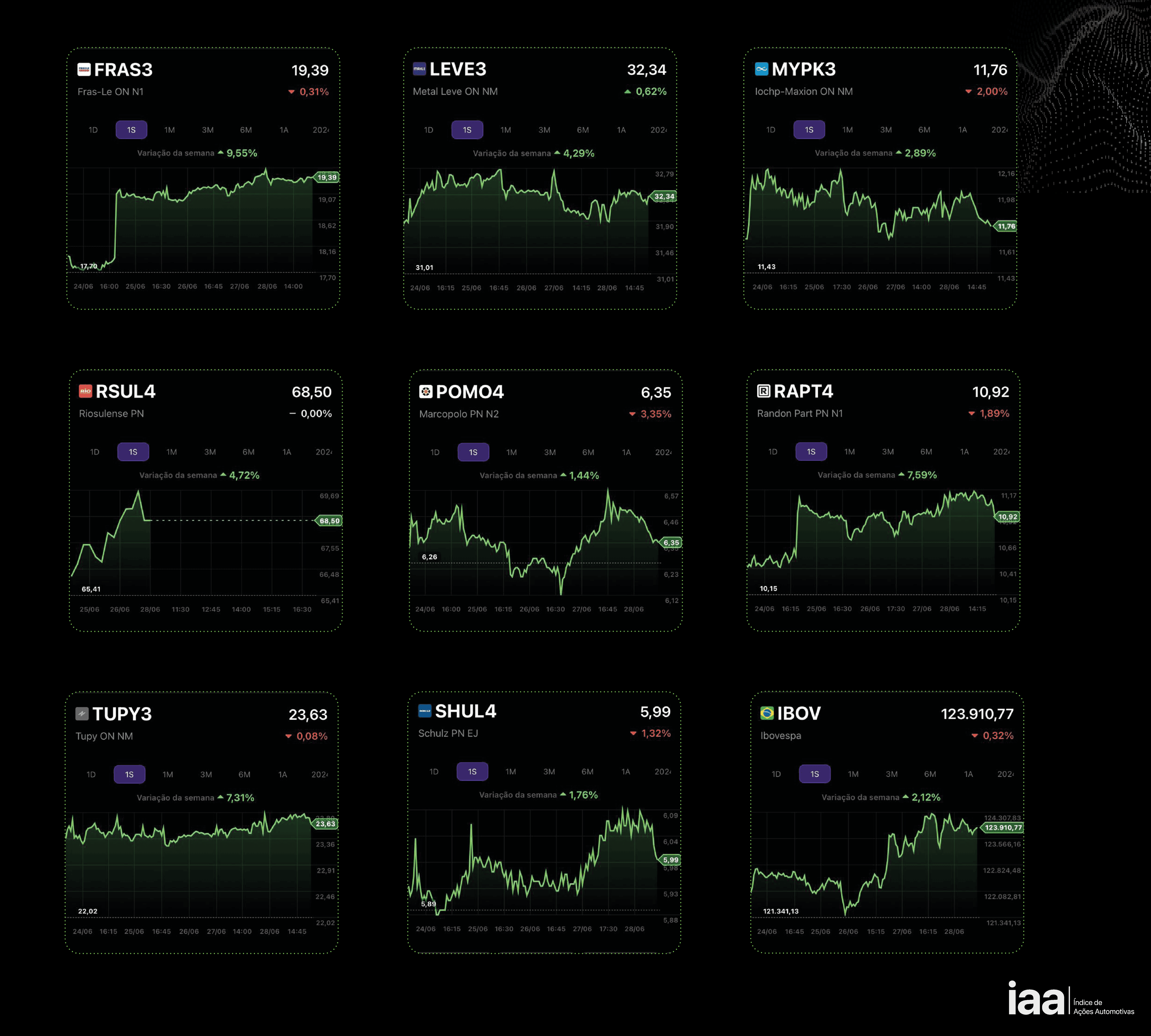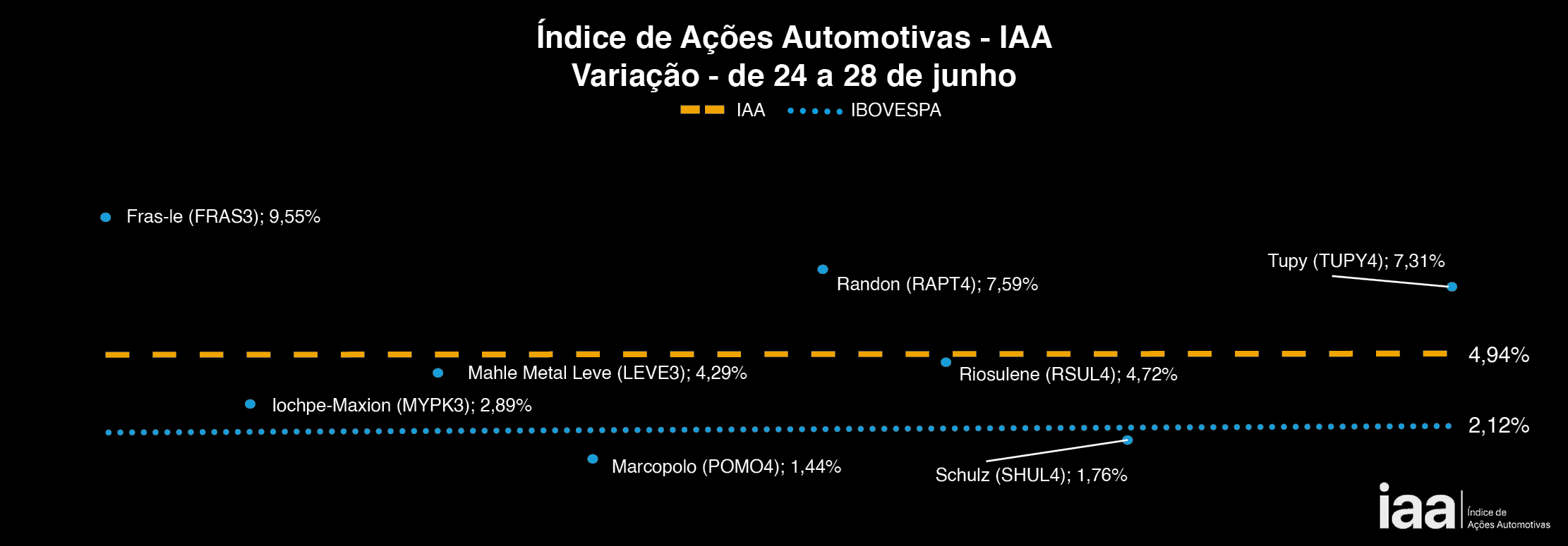 As ações automotivas foram destaque na Bolsa de Valores de São Paulo na semana de 24 a 28 de junho. Todas as empresas listadas obtiveram resultados positivos levando o IAA, índice que mede o desempenho desses ativos, a encerrar a semana em +4,94%, superando, pela segunda semana consecutiva o Ibovespa, principal indicador do mercado financeiro no Brasil, que ficou em +2,12%.