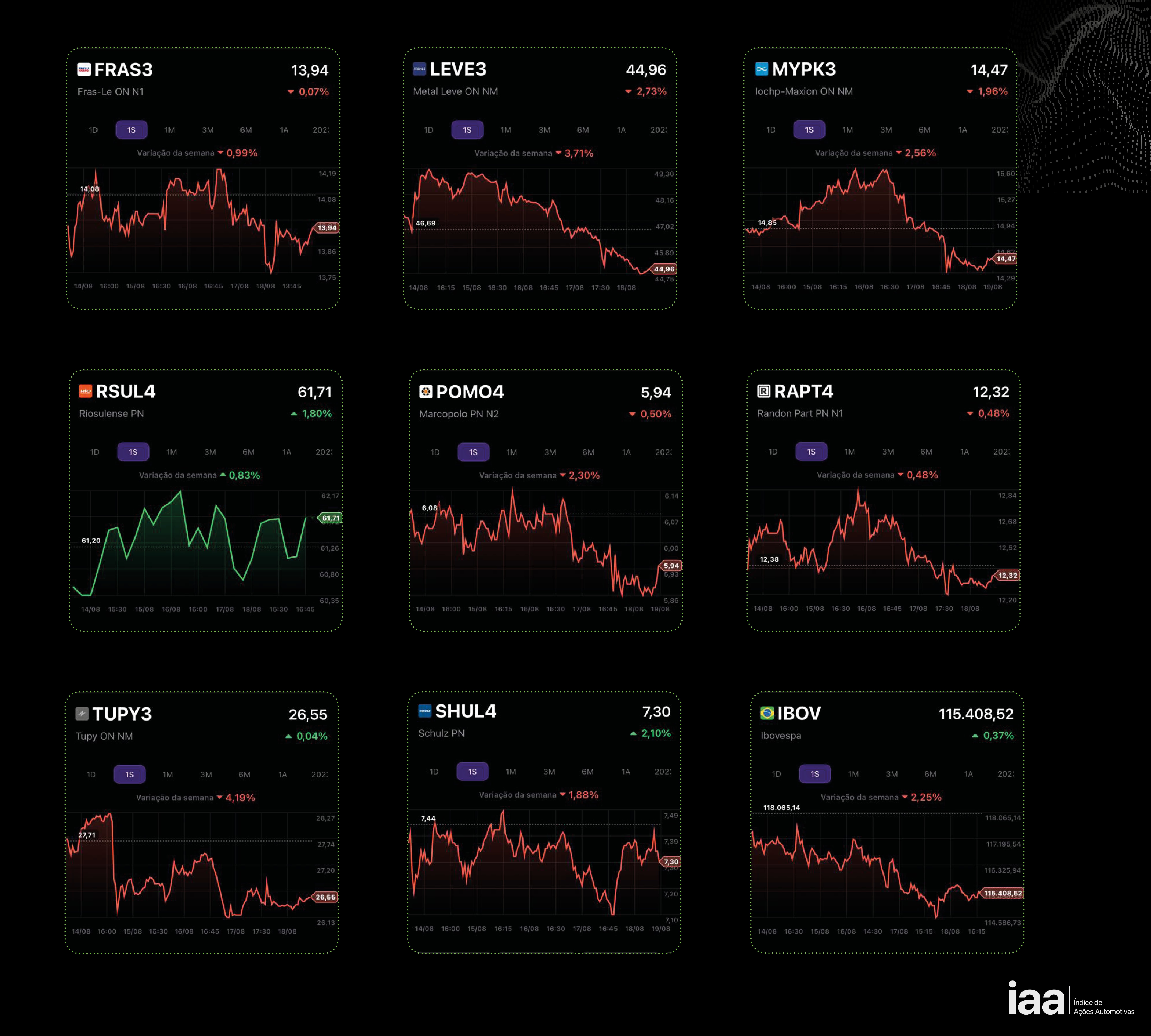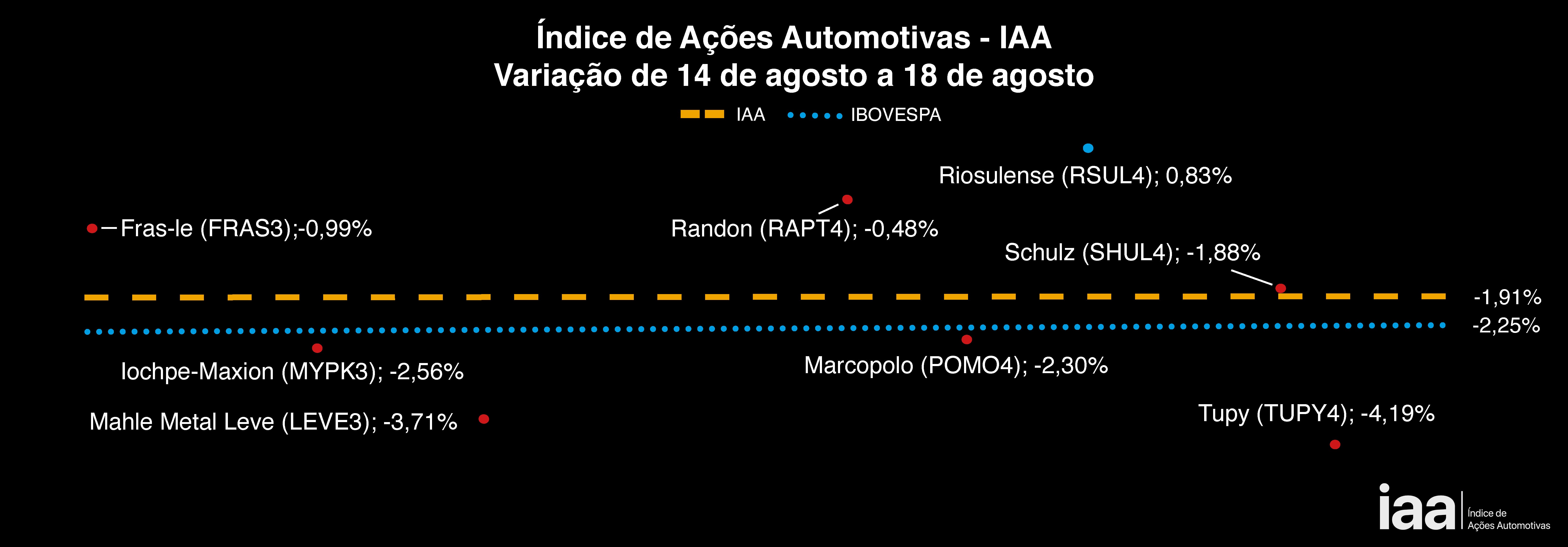 Tal resultado refletiu no IAA, índice que mede o desempenho das ações automotivas, cuja variação semanal foi de -1,91%. Após um período de valorizações, todas as ações fecharam a semana em queda, com exceção as da Riossulense (RSUL4) 0,88%.