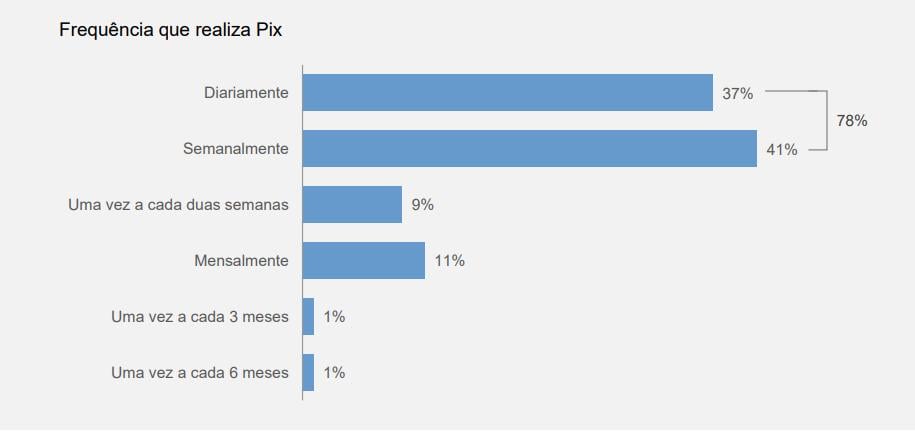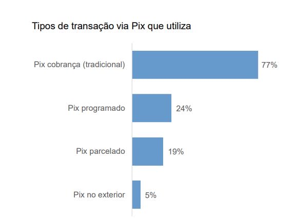 Um dado curioso apontado é o de que o Pix já é um aliado dos consumidores na hora de pagar os boletos – 76% já usam para pagar as faturas de água, luz e outros gastos mensais. O item só fica atrás da transferência de valores a amigos e familiares (88%), mas supera o pagamento de serviços como diarista e babá, por exemplo (68%). No quesito compras, 76% já utilizaram o meio de pagamento em estabelecimentos comerciais físicos. Analisando por setor, em todos os ambientes de uso online ou físico, o Pix é usado principalmente em supermercados (63%), restaurantes (60%), farmácias (58%), marketplaces (50%), apps de delivery (46%), no ato da entrega do delivery (43%) e plataformas de serviços online como streaming, jogos e cursos (34%). O meio de pagamento é utilizado diariamente por 21% dos entrevistados, de três a seis vezes por semana por 20%, e de uma a duas vezes, por 22%. Mesmo com o receio de fraudes, 64% acreditam que o Pix é uma transação muito segura. Os tipos mais utilizados são Pix Cobrança tradicional (77%), seguido pelo Pix Programado (24%) e Pix Parcelado (19%, apesar de não ser uma solução oficialmente lançada pelo BC) – 5% já usaram o Pix no exterior. As interfaces mais usadas para as transações são chave Pix (94%), QR Code (60%) e via link Copia e Cola (49%).